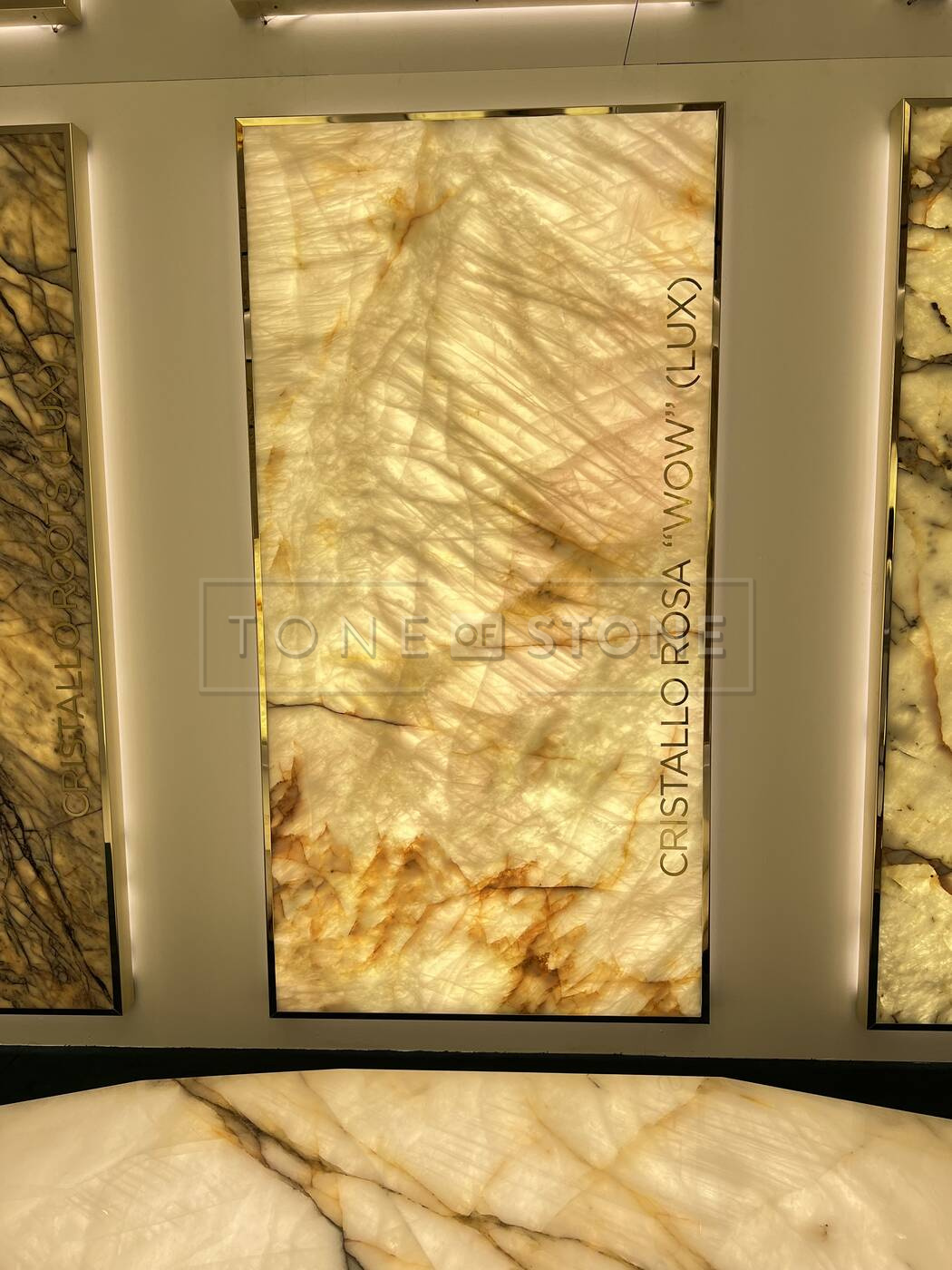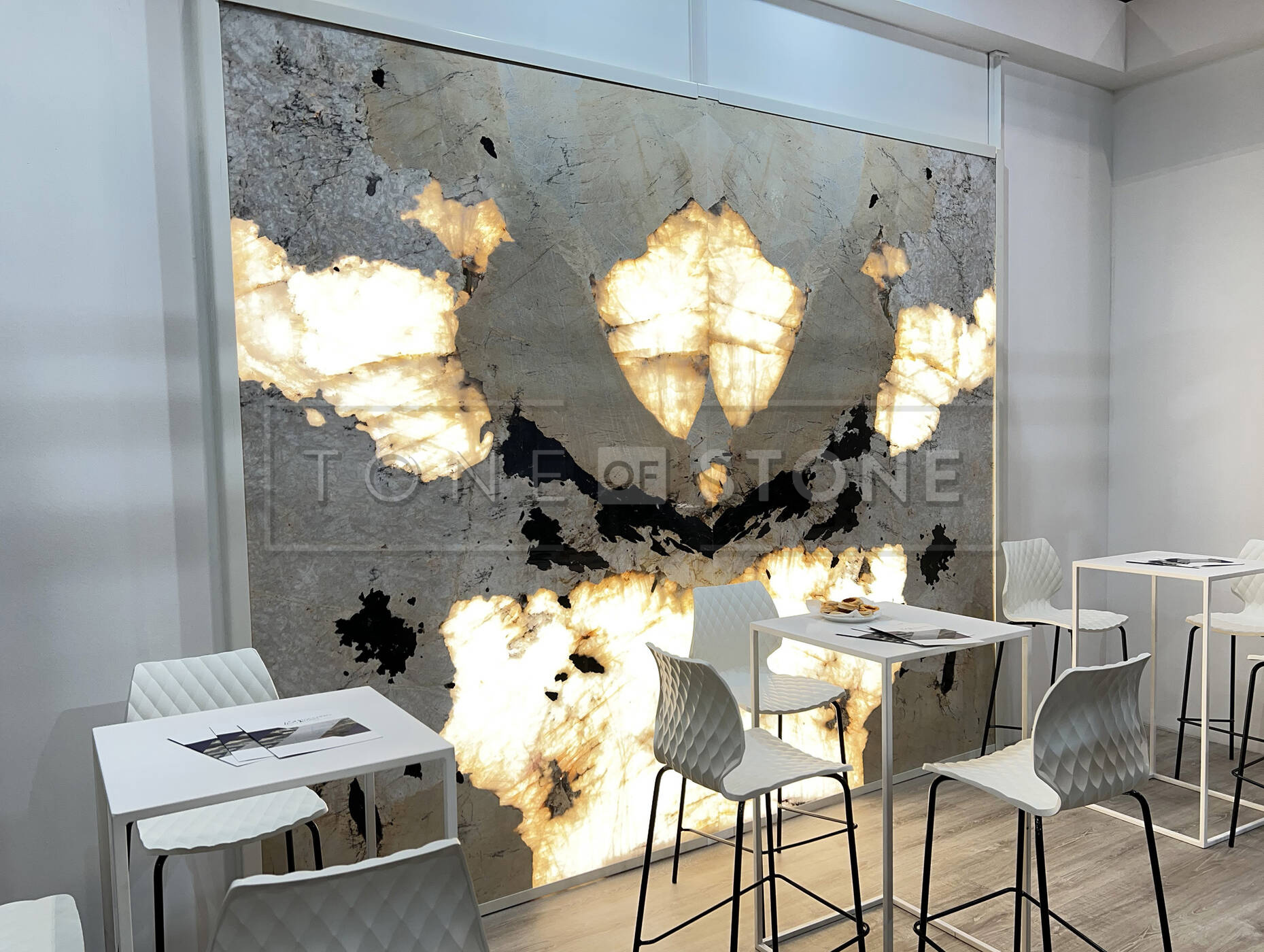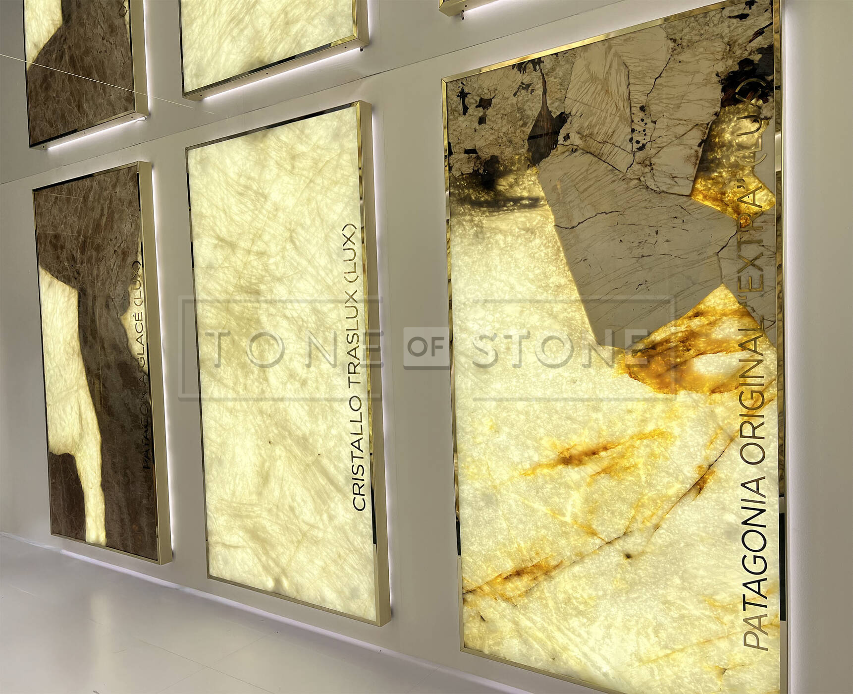 Ukázka: Prosvícené kamenné obklady stěn z přírodního kamene: kvarcit Cristallo, kvarcit Patagonia.