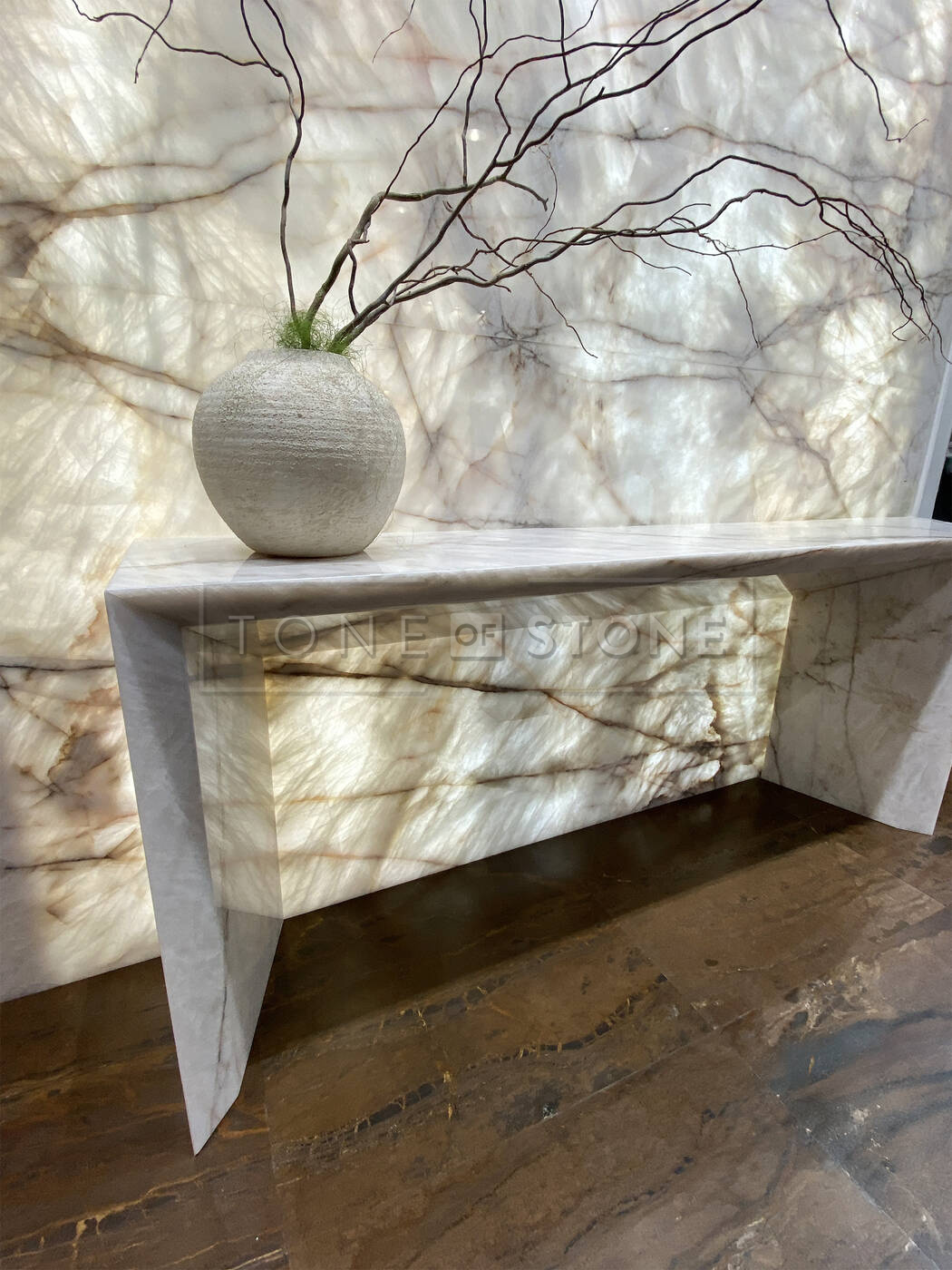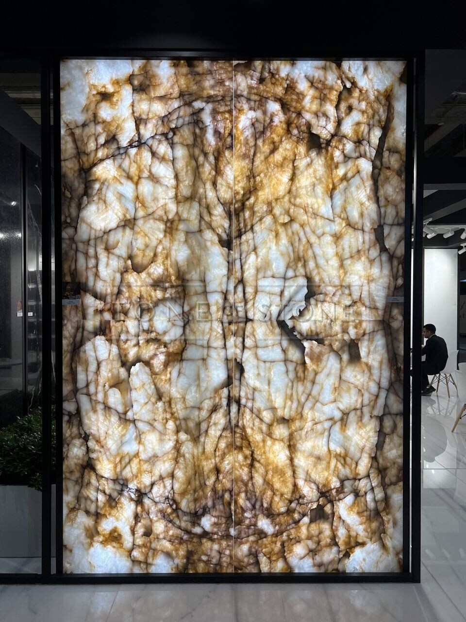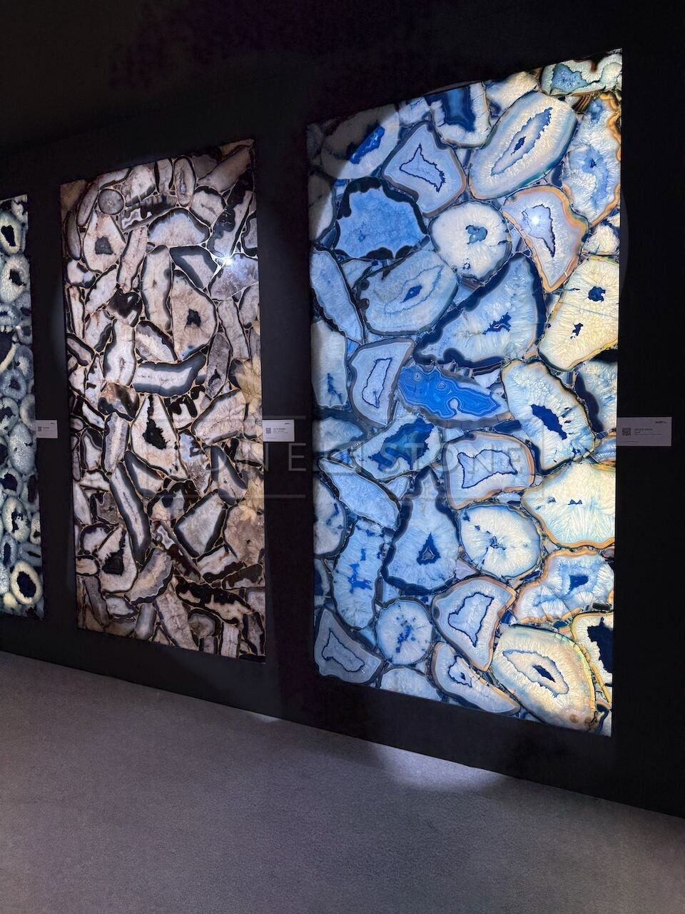 Ukázka: Prosvícené kamenné obklady stěn z přírodního kamene: kvarcit Cristallo, kvarcit Patagonia.