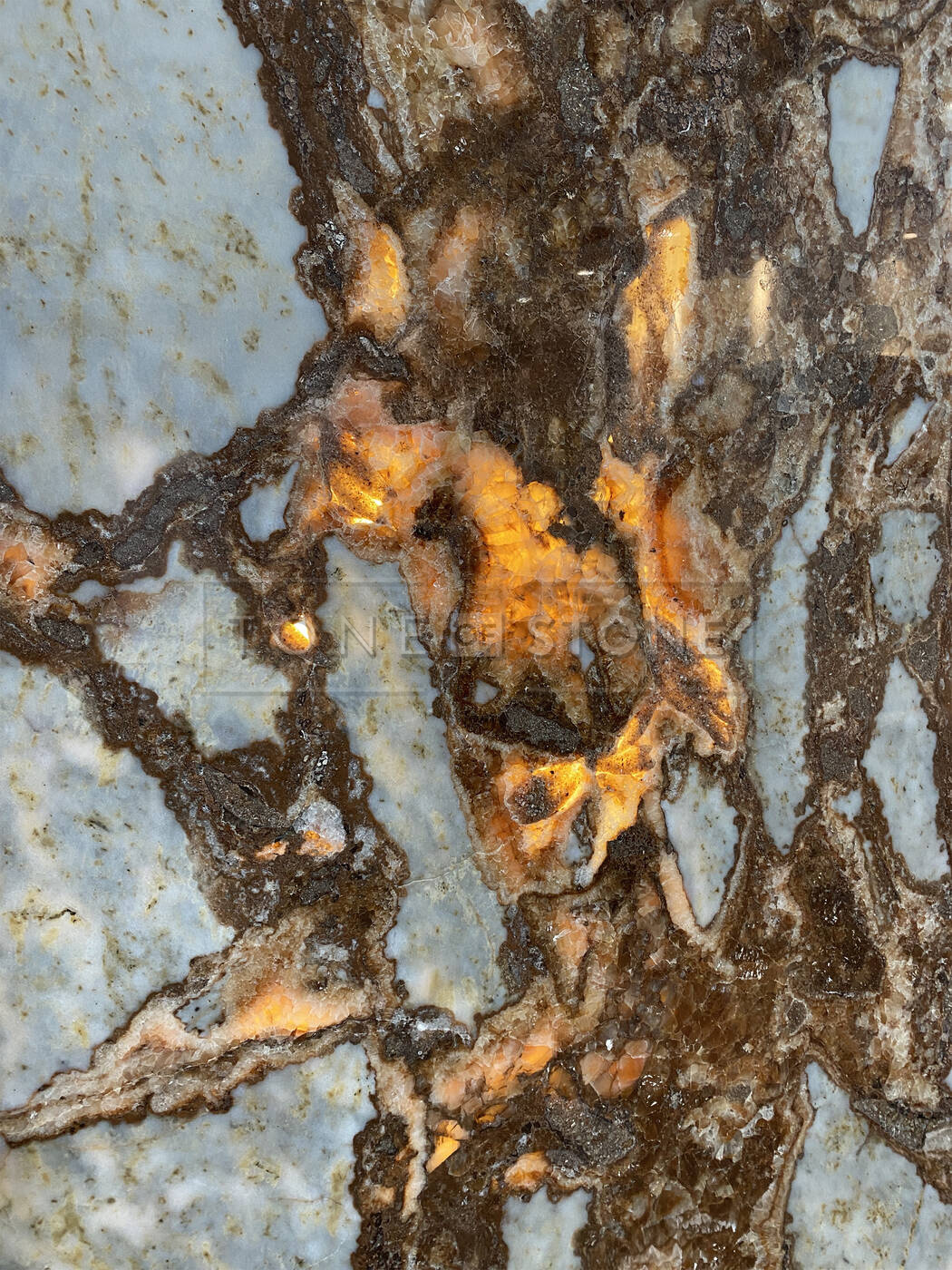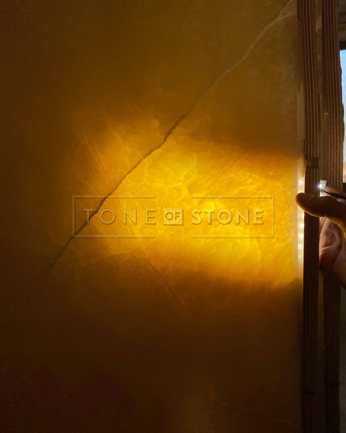 Ukázka: Prosvícení kamenných desek: Obrázek č.1: Podsvícená onyová deska Onyx Gioiello, Obrázek č.2: Prosvícená žíla přírodního kamene - žula Magma Black.