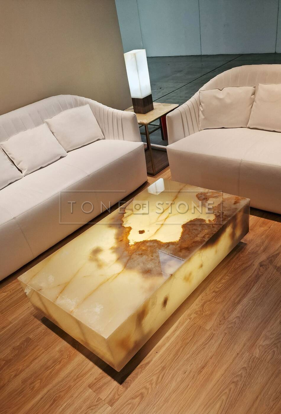 Ukázka: Prosvícení přírodního kamene: Obrázek č.1: Prosvícený mramorový stolek z bílého mramoru Bianco Carrara Extra. Obrázek č.2: Podsvícená onyxová stěna baru z přírodního kamene Onyx Miele.