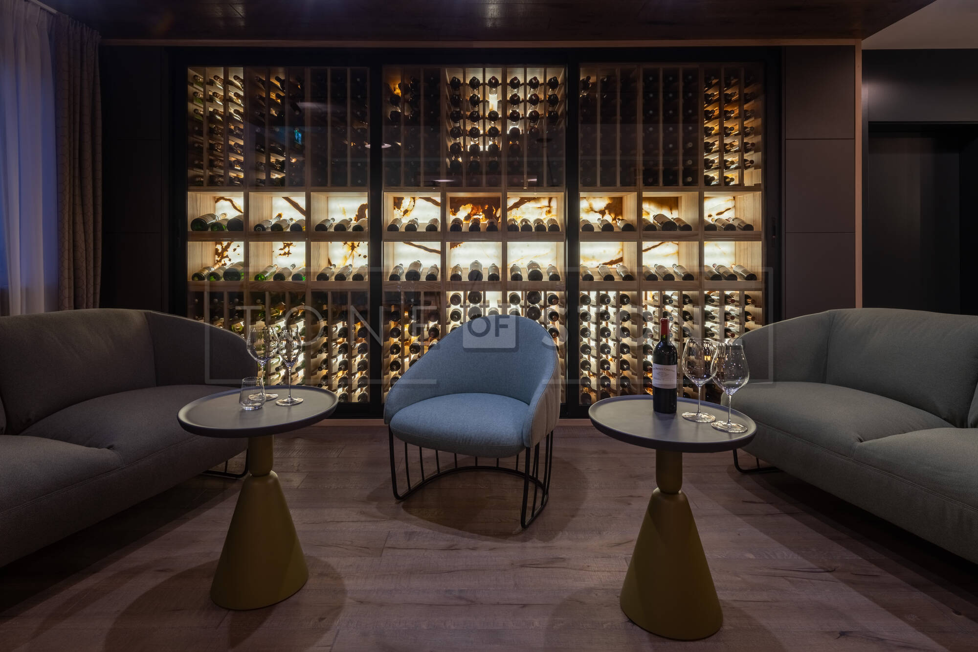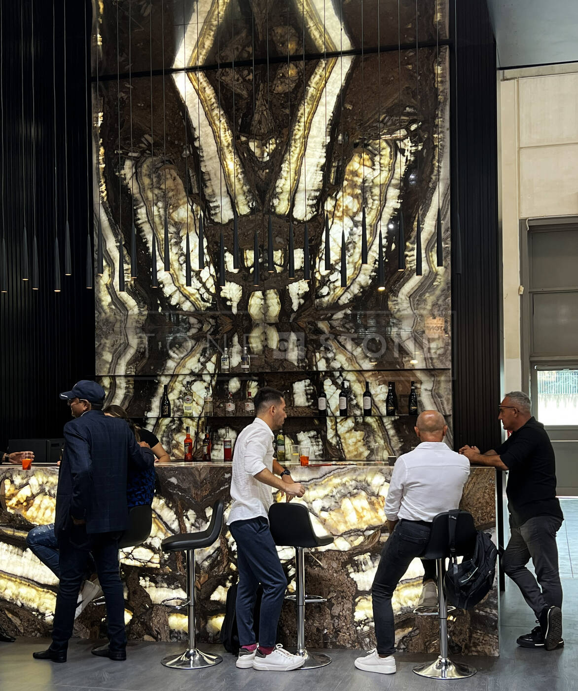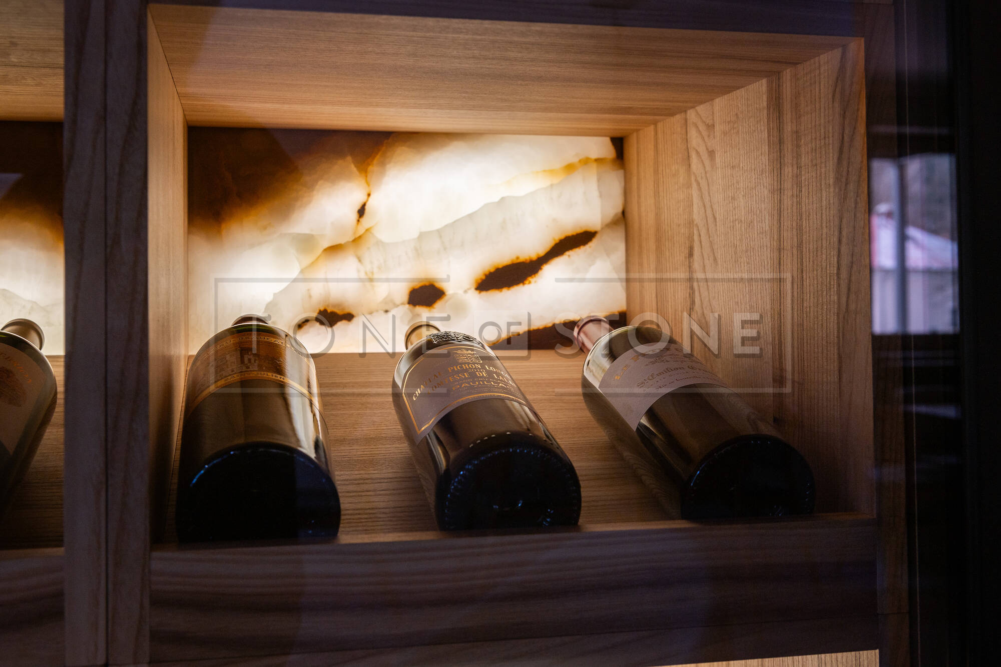 Realizace: Prosvícený onyxový obklad luxusní vinotéky z přírodního kamene Onyx Verde (Onice Verde).