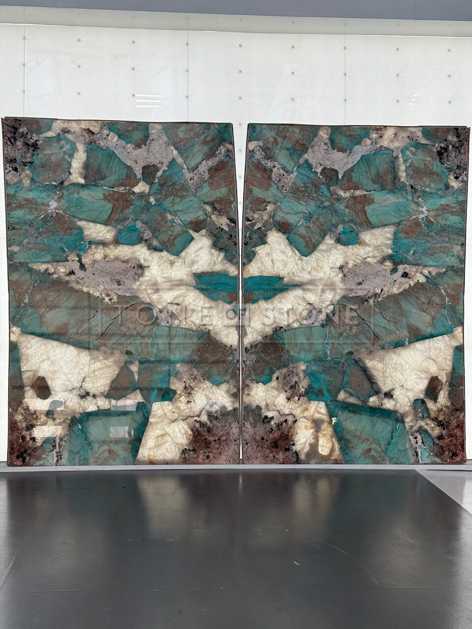 Ukázka: Prosvícené kamenné desky: Obrázek č.1: Prosvícený kvarcit - kamenný obklad stěny technikou bookmatch. Obrázek č.2: Podsvícené kamenné desky přírodních polodrahokamů.