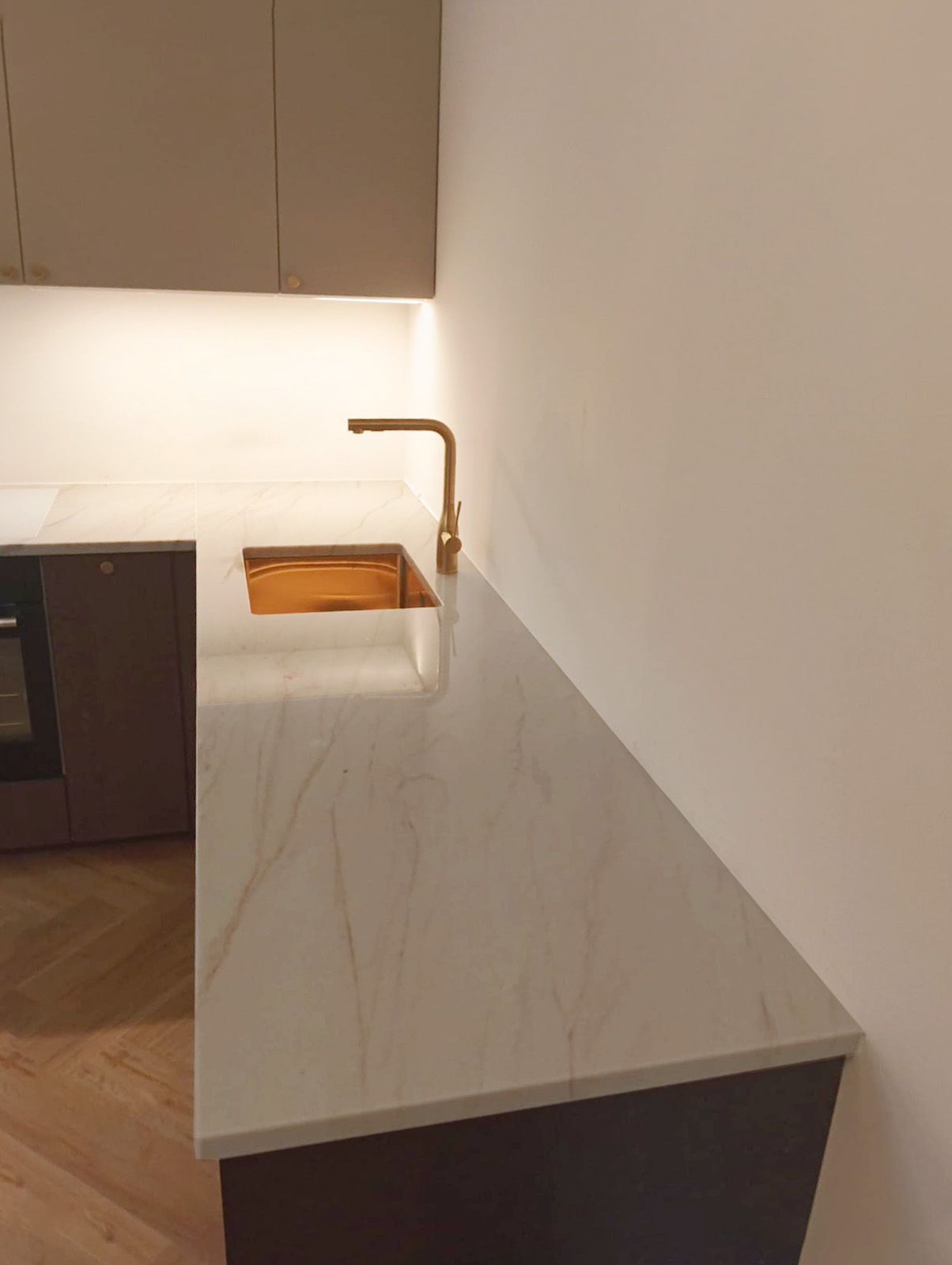 Kromě koupelnové desky byla vyrobena také kamenná kuchyňská deska ze stejného materiálu o rozměrech 250 × 63,5 cm a 137 × 63,5 cm, díky čemuž se přírodní kavrcit Sky Gold stal jednotícím prvkem interiéru kuchyně a koupelny. Součástí realizace kvarcitové kuchyňské desky byla i výroba výřezu pro baterii, pro dřez se spodní montáží a výřez pro varnou desku zapuštěnou do roviny.