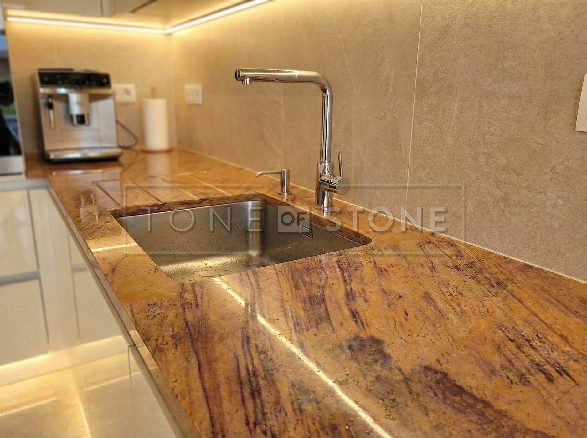 Kuchyňská deska z kvarcitu Las Vegas Rock v lesklé povrchové úpravě s dřezem a kuchyňskou baterií