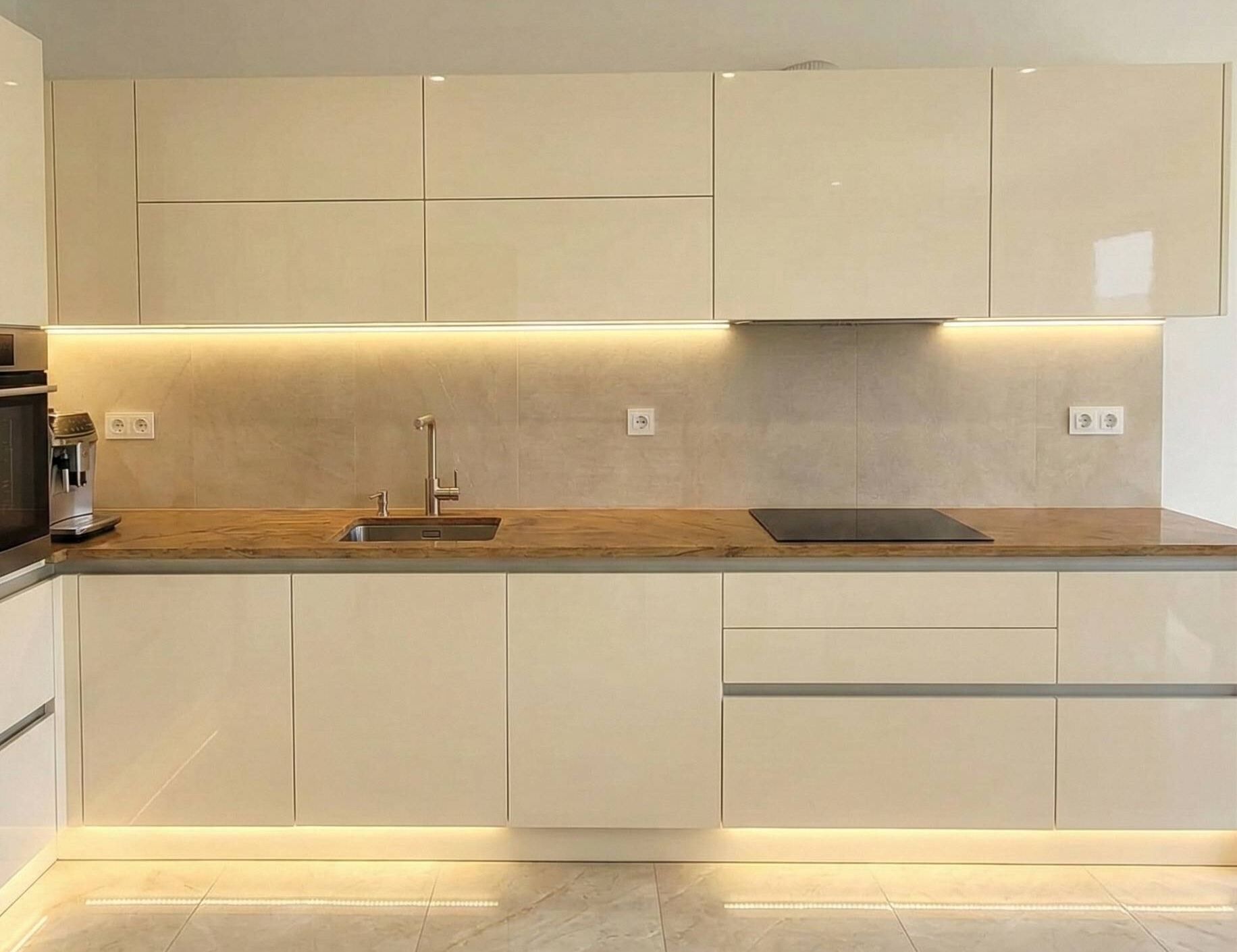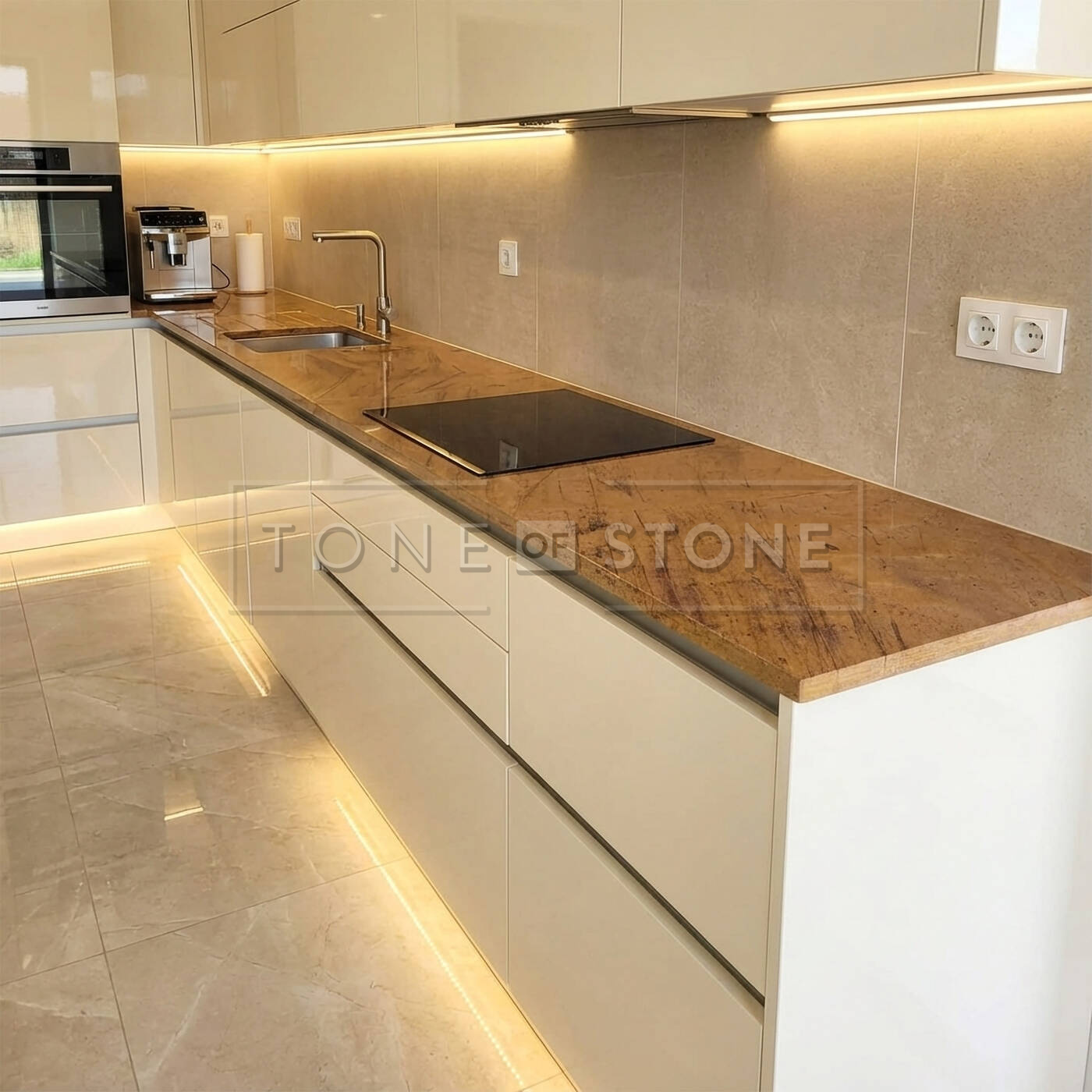 Kuchyňská deska z kvarcitu Las Vegas Rock v lesklé povrchové úpravě s varnou deskou a dřezem s kuchyňskou baterií