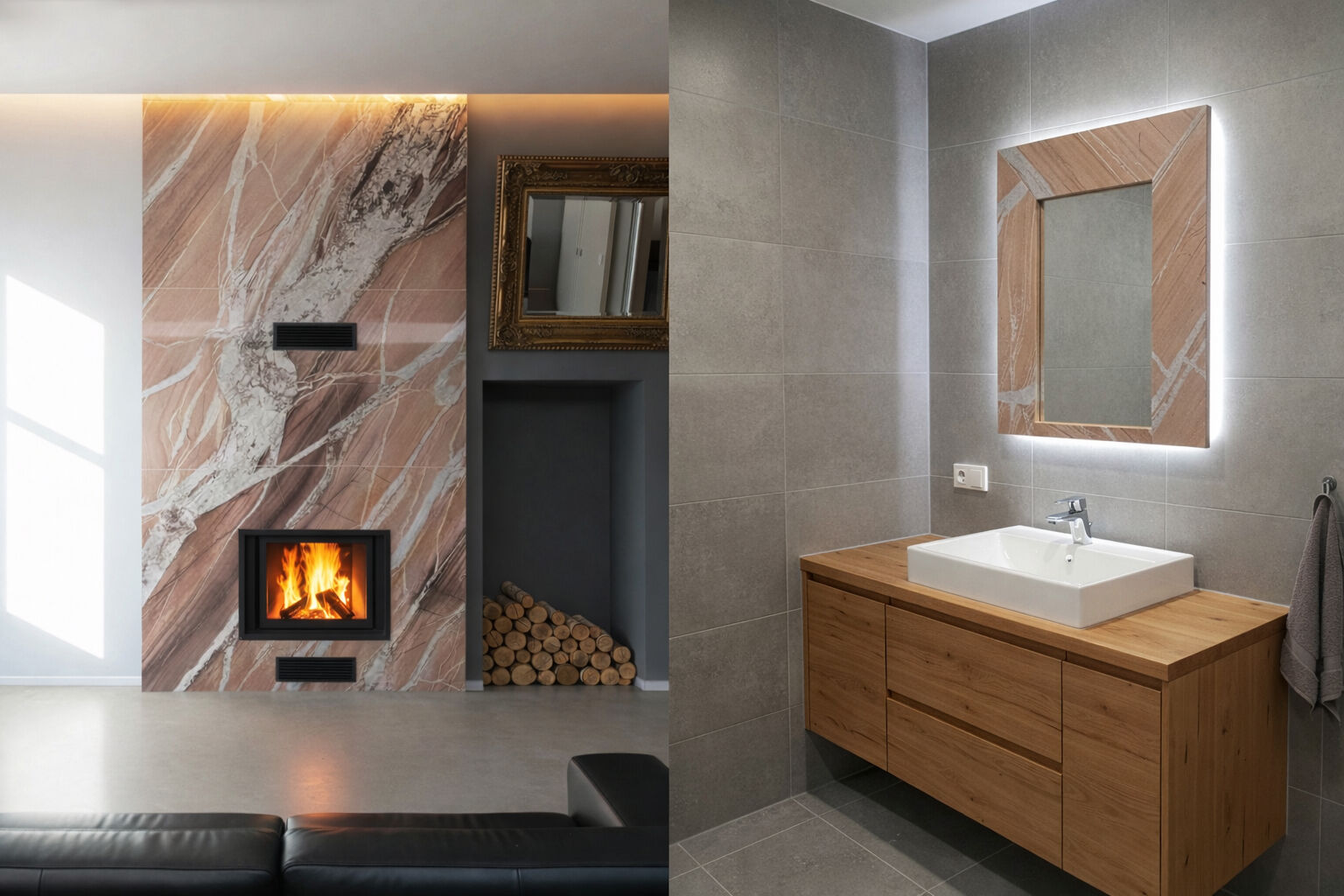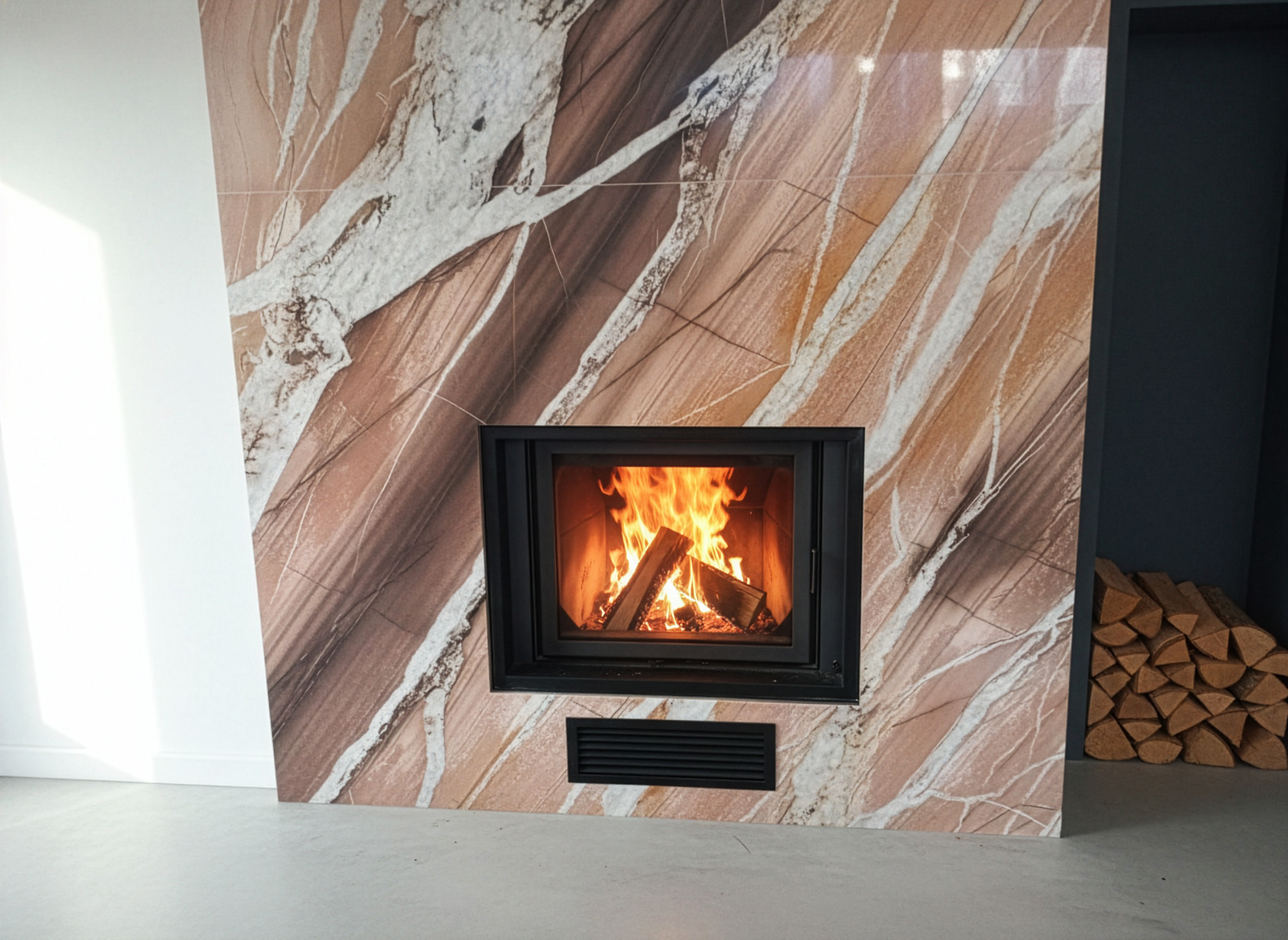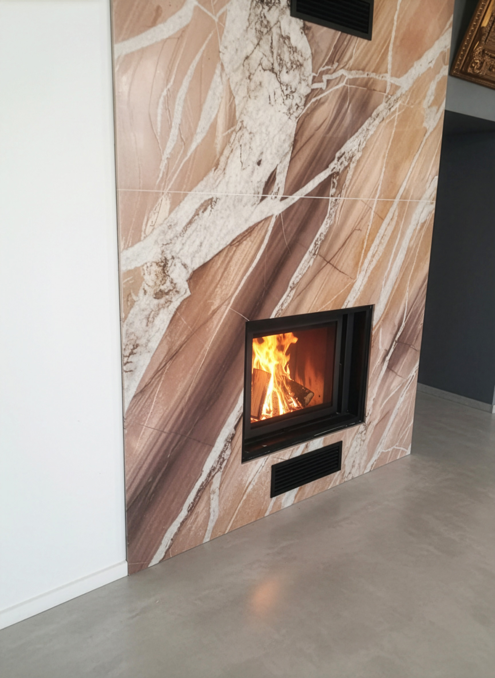 Krb je v interiéru místem, které přirozeně přitahuje pozornost. Není to jen zdroj tepla, ale také vizuální kotva prostoru – prvek, kolem kterého se odehrává každodenní život. V této realizaci jsme se zaměřili na kamenný obklad krbu z exkluzivního kvarcitu Splendido, který byl doplněn obkladem zrcadla vytvořeným ze zbytkového materiálu.