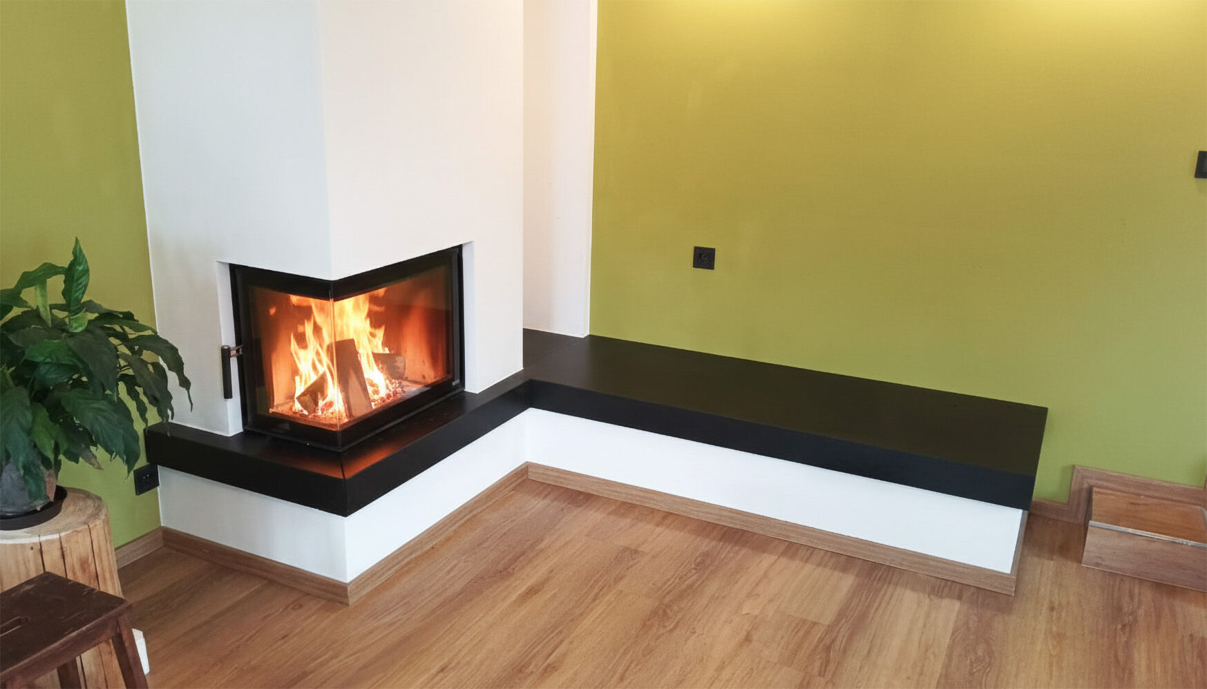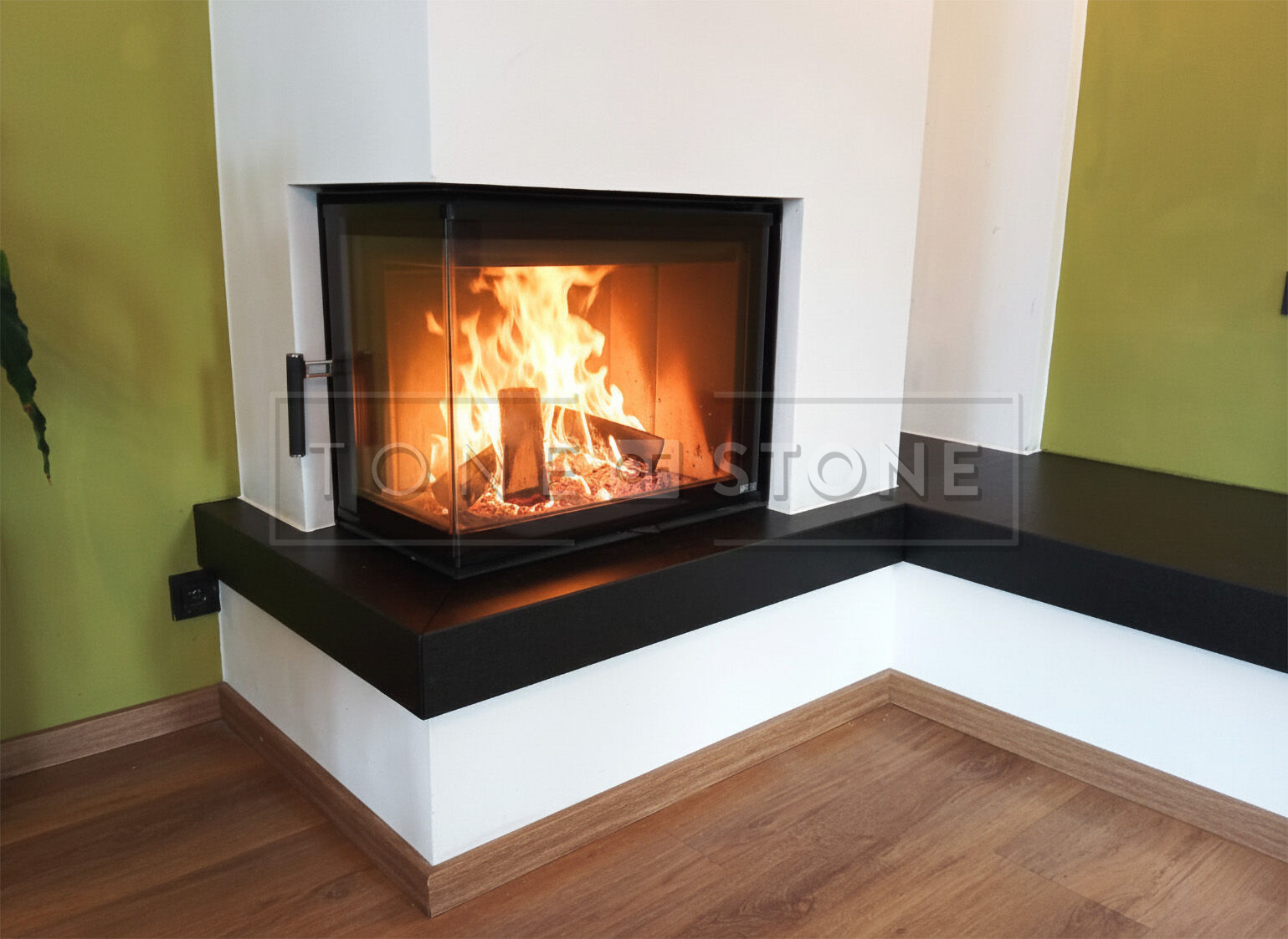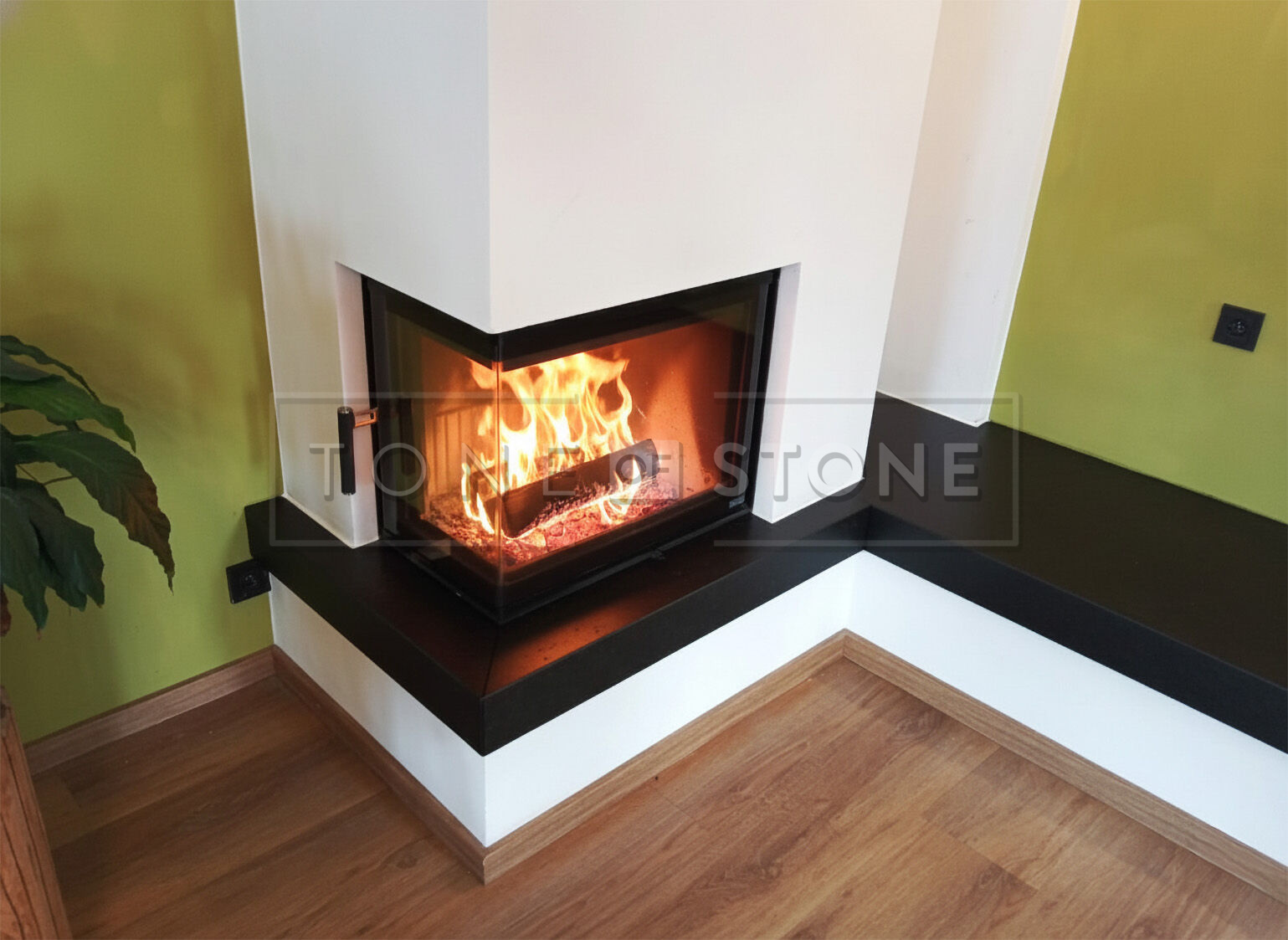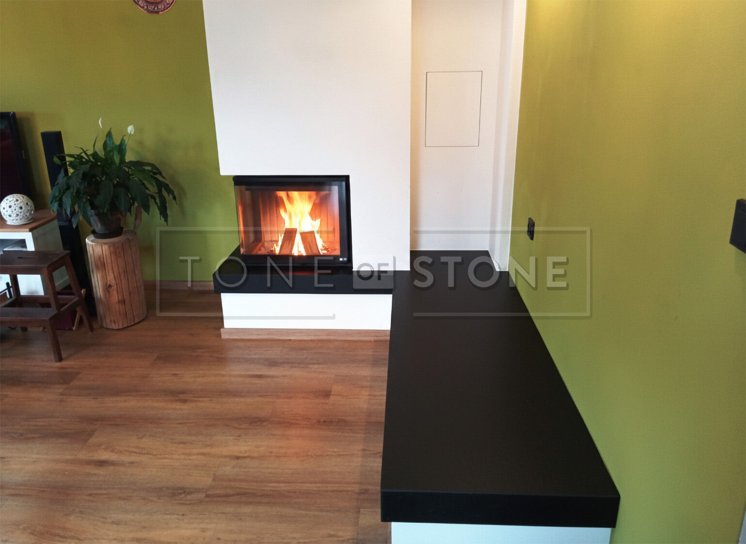 Kamenná krbová římsa plní nejen ochrannou, ale i vizuální funkci. Použití lepené pohledové hrany na 45° vytváří efekt masivního kamenného prvku s širokým pohledovým okrajem, aniž by bylo nutné použít silnější materiál. Výsledkem je čistý detail s důrazem na precizní provedení.