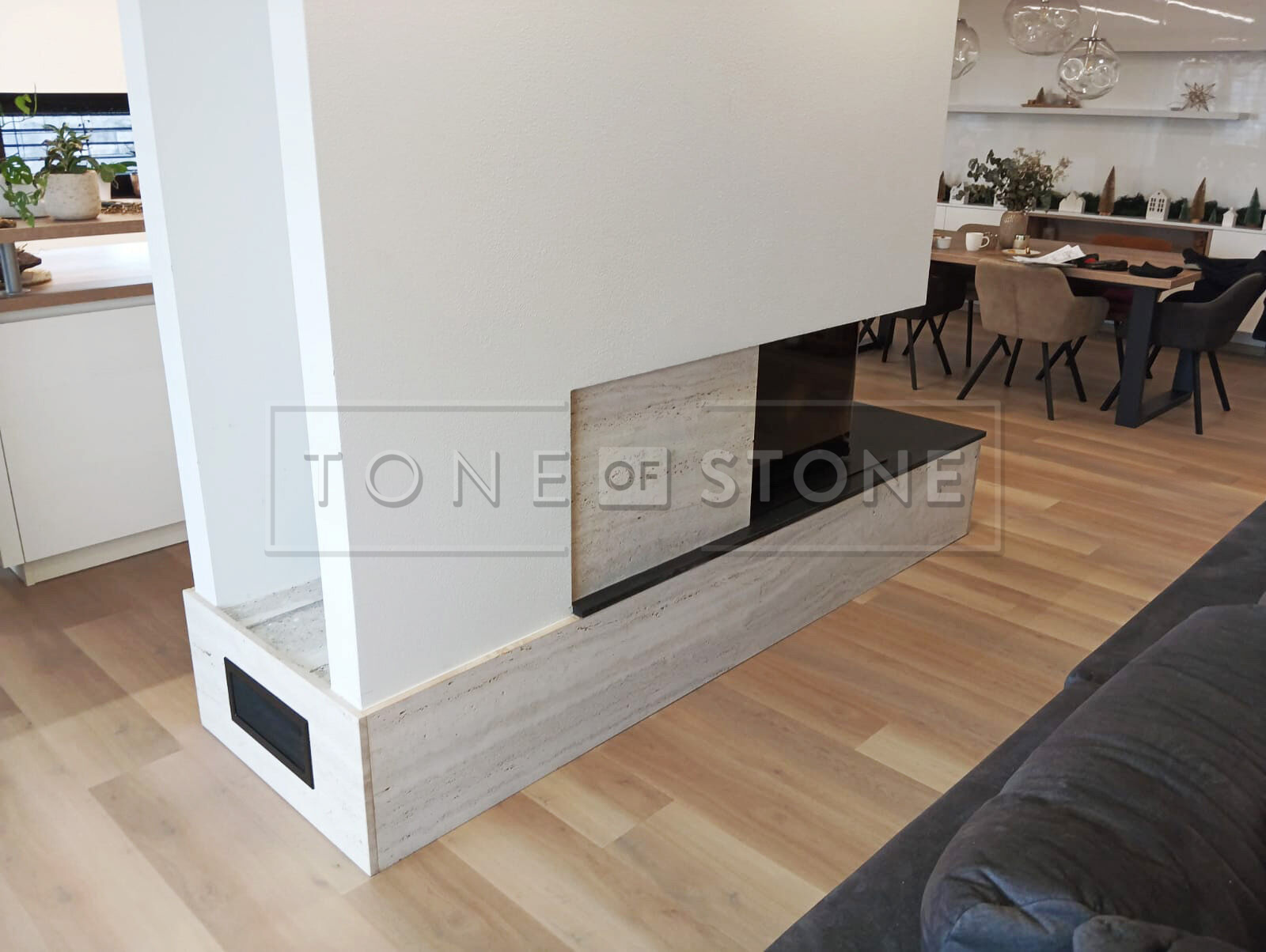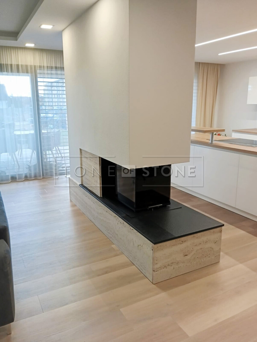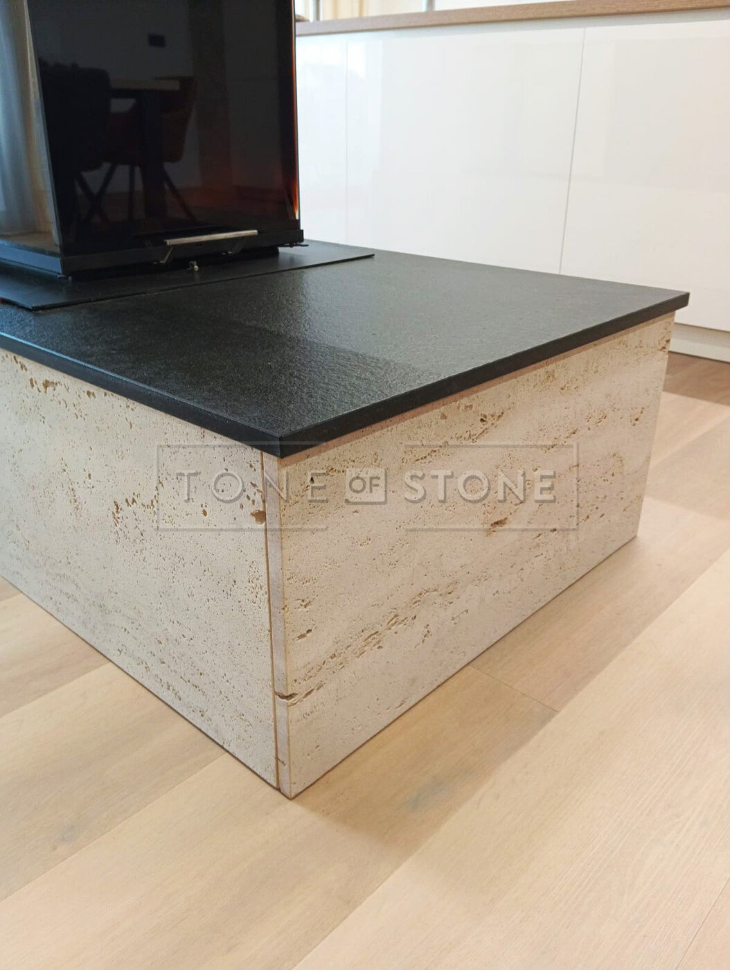 Pečlivě zpracovaný travertinový obklad krbu doplněný kontrastní černou žulou Nero Assoluto Zimbabwe proměnil tento interiér v prostor s výrazným charakterem a přírodní elegancí. Realizace ukazuje, jak může kamenný obklad krbu propojit funkčnost a estetiku v nadčasový vzhled, který obstojí v každém stylu.