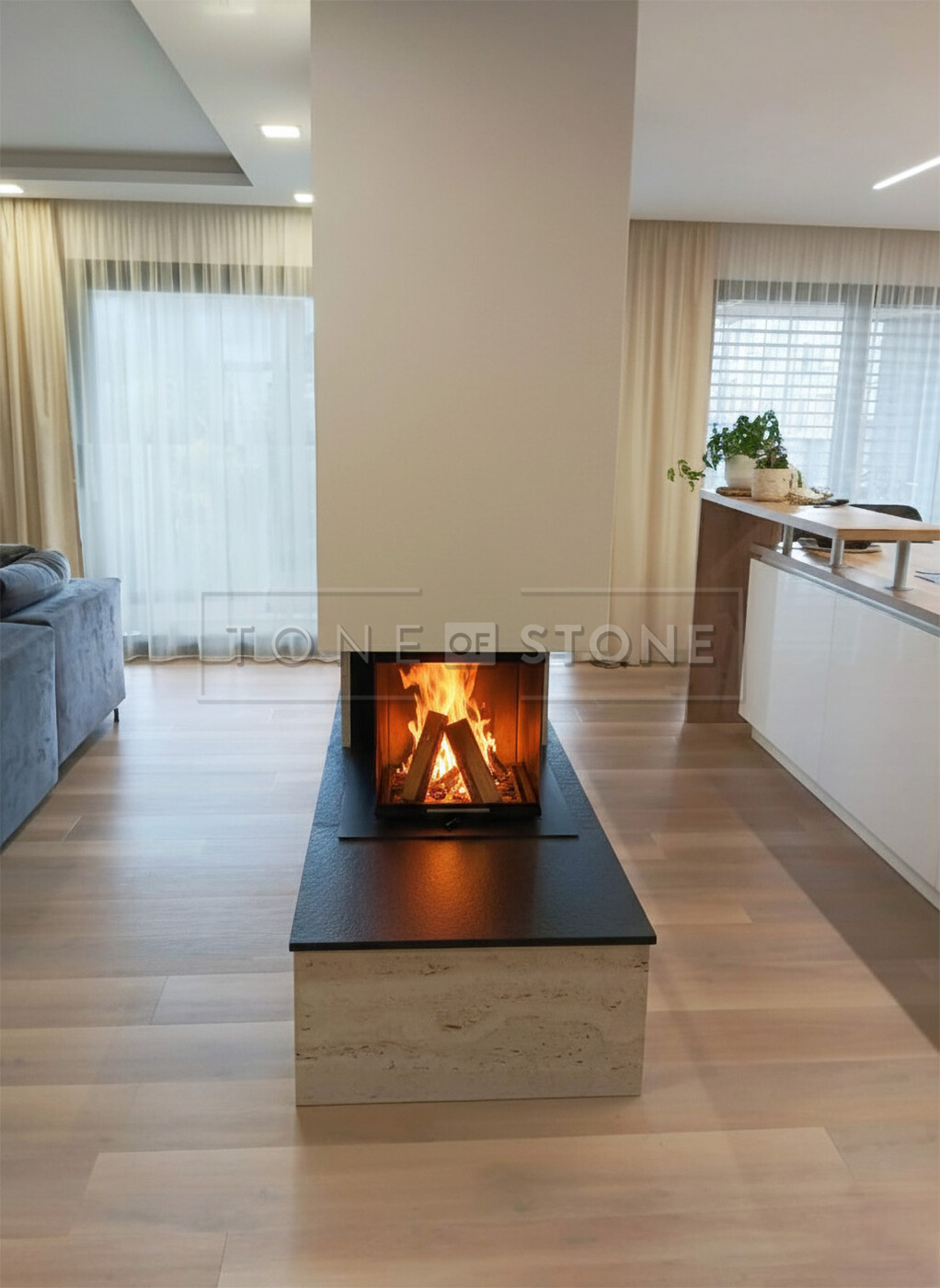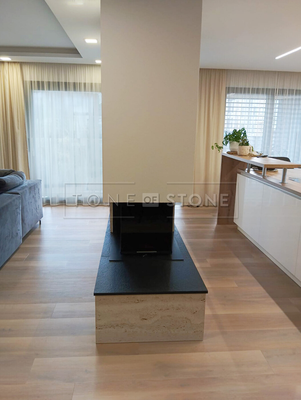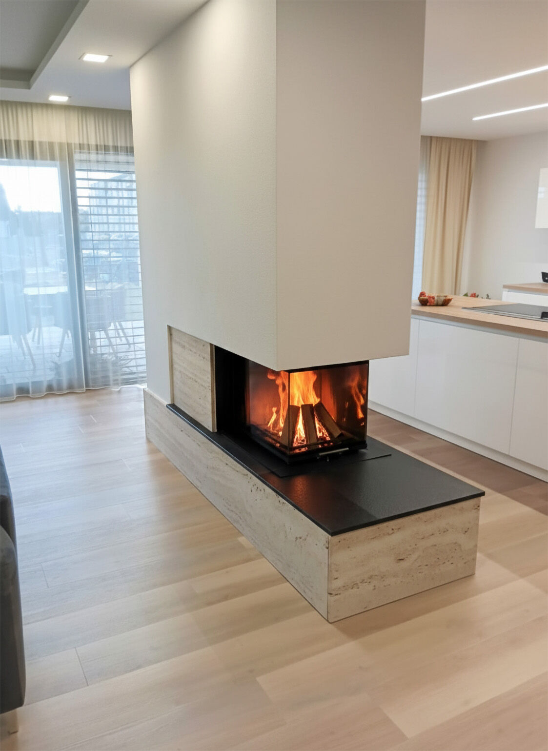 Pečlivě zpracovaný travertinový obklad krbu doplněný kontrastní černou žulou Nero Assoluto Zimbabwe proměnil tento interiér v prostor s výrazným charakterem a přírodní elegancí. Realizace ukazuje, jak může kamenný obklad krbu propojit funkčnost a estetiku v nadčasový vzhled, který obstojí v každém stylu.