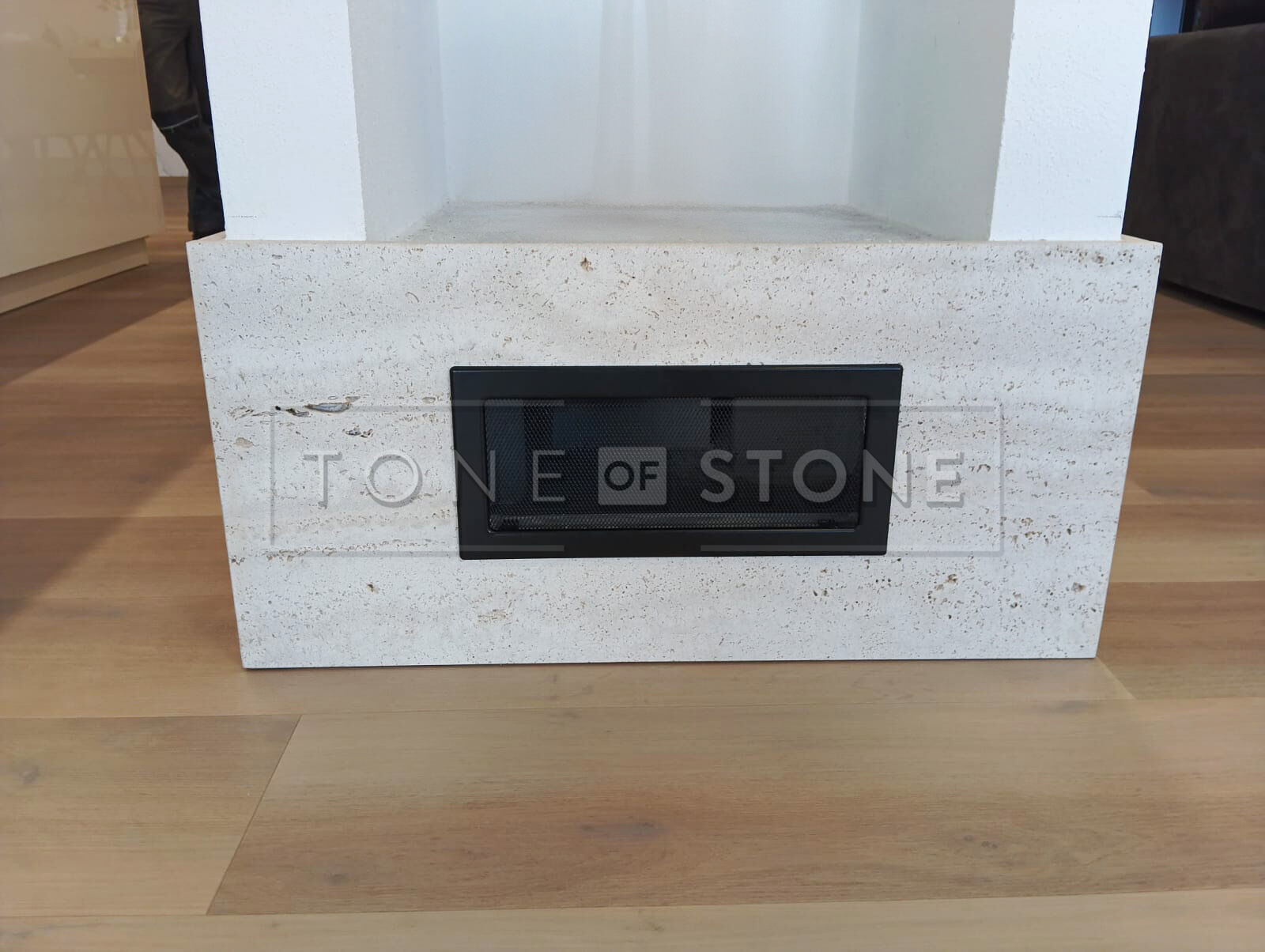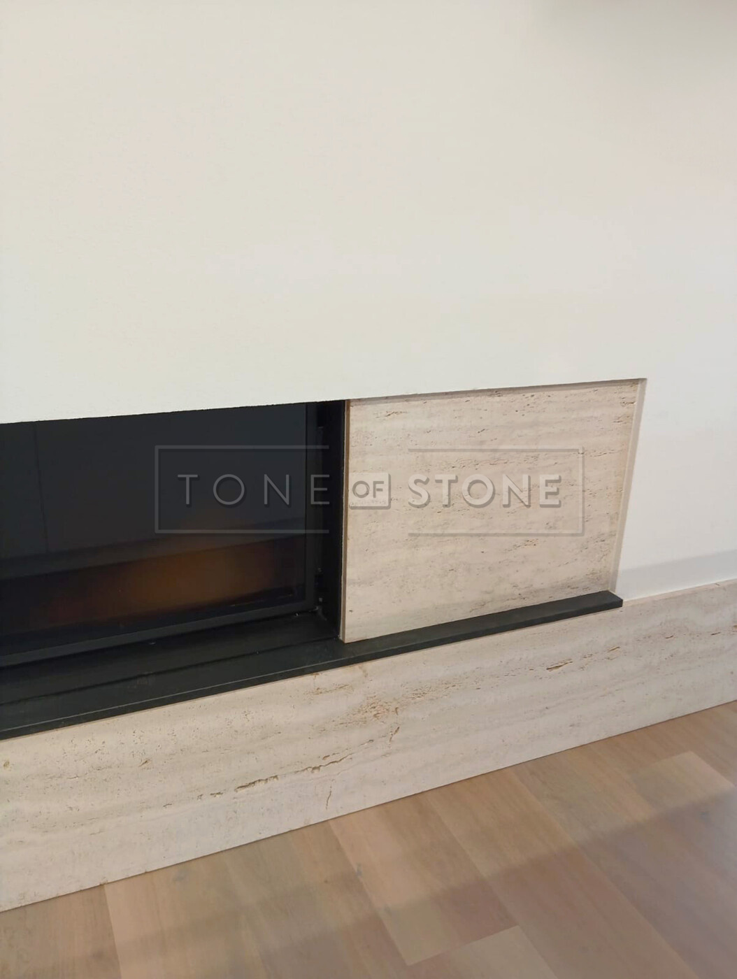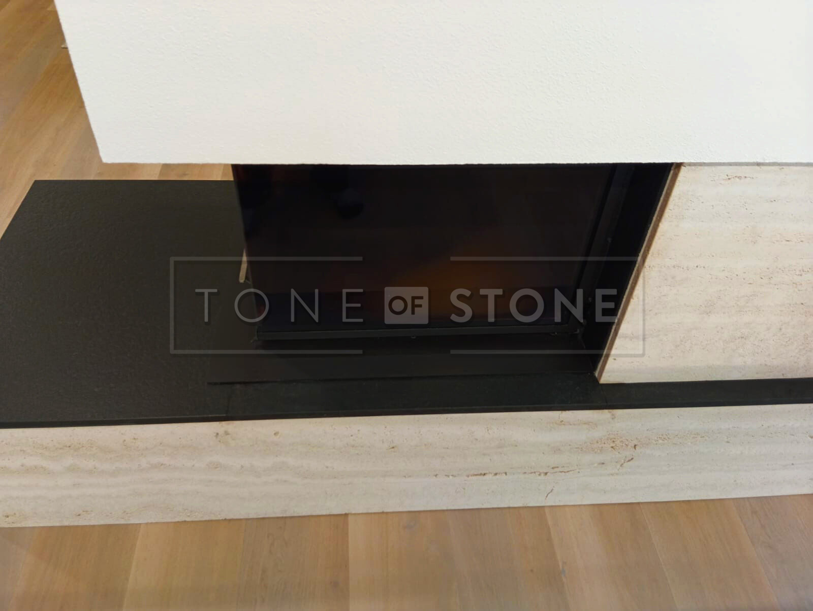 Ukázka: Obklad krbu a krbové římsy z přírodního kamene Travertino Romano Classico a Nero Assoluto Zimbabwe.