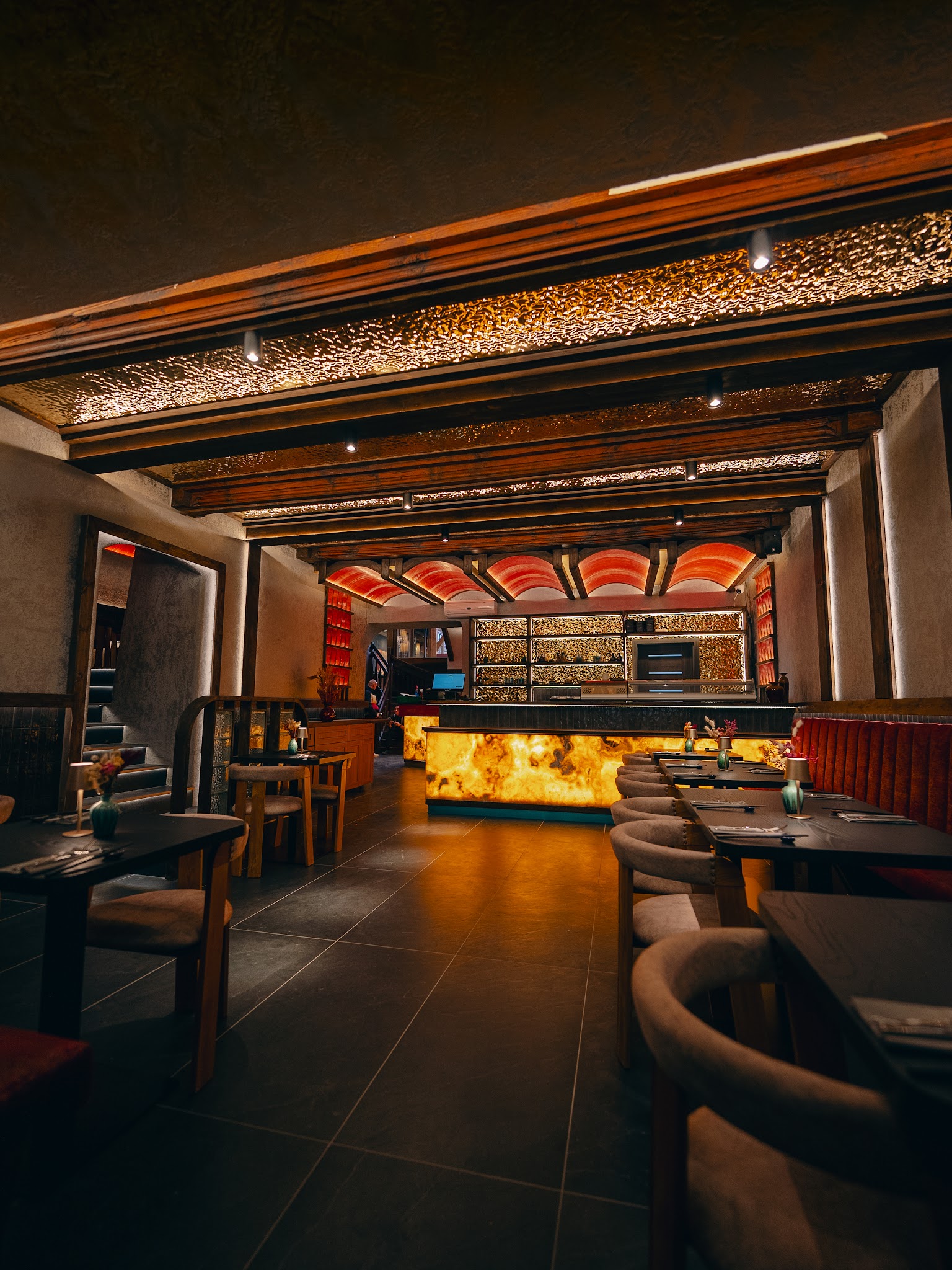 Prosvícený onyxový obklad baru tak nepůsobí rušivě, ale naopak vytváří jemnou, příjemnou světelnou kulisu, která podtrhuje charakter restaurace a dodává prostoru hloubku.