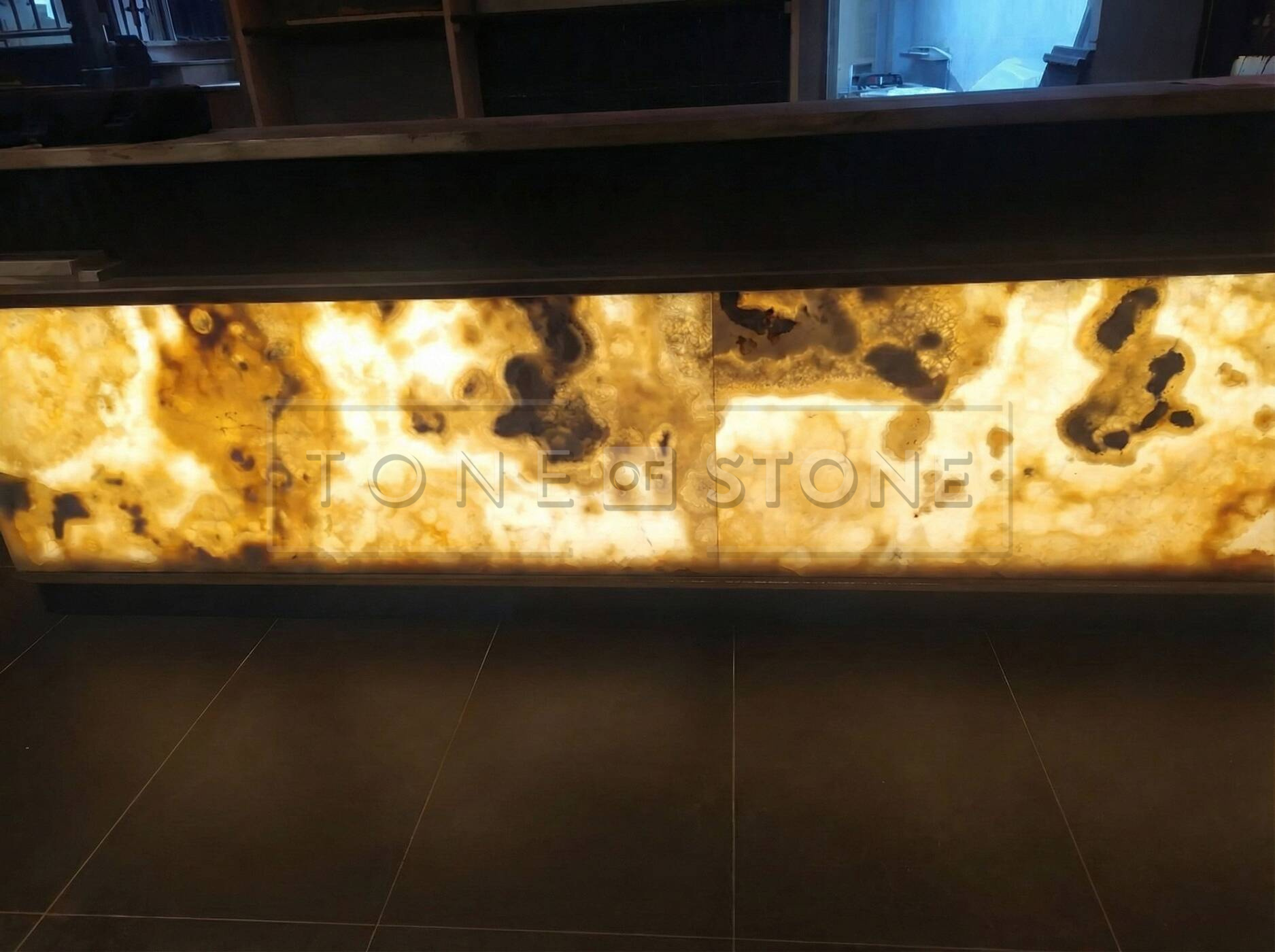 Výsledkem je onyxový obklad baru, který nepůsobí jen jako obklad – stává se součástí atmosféry celého prostoru.