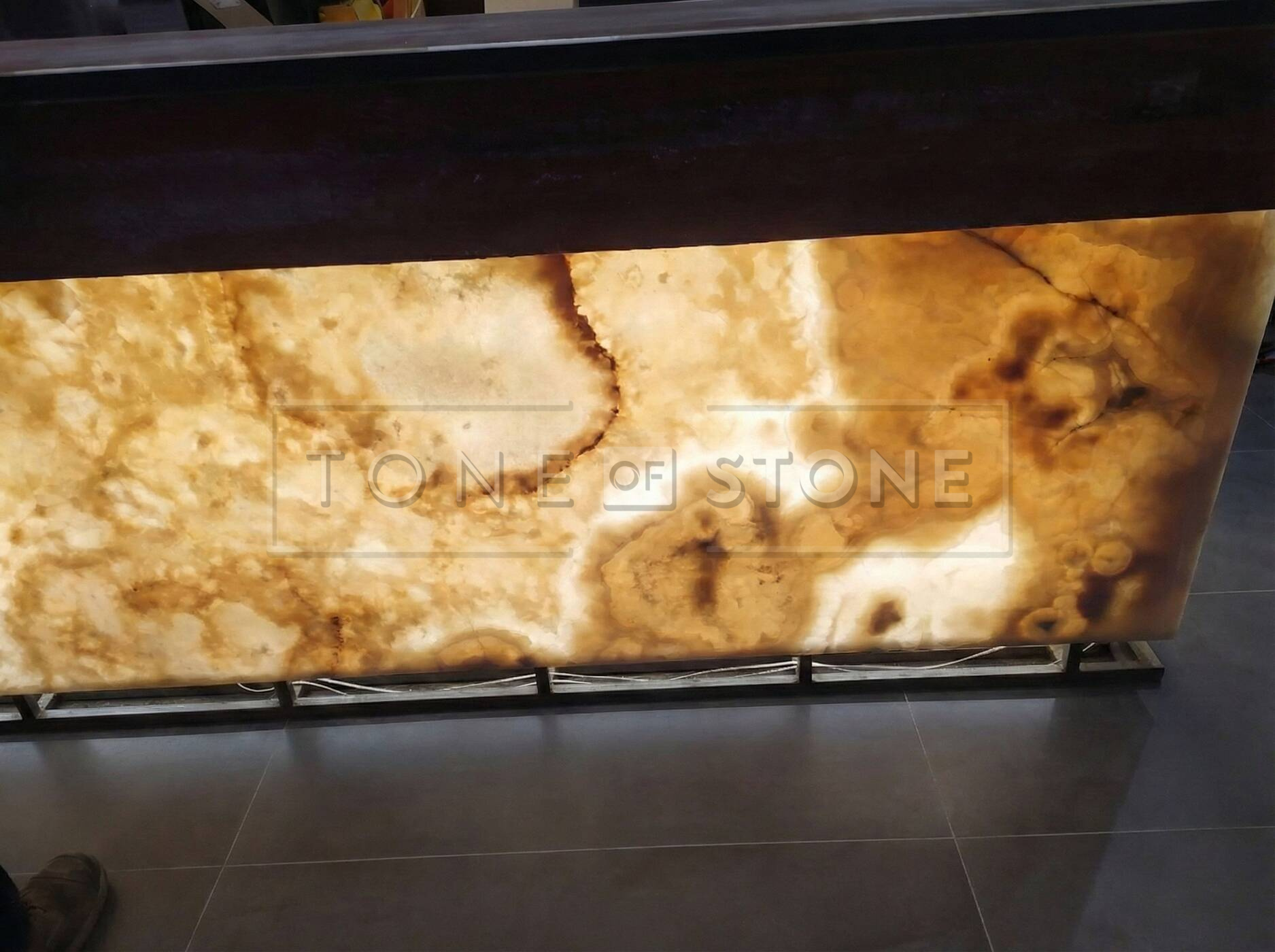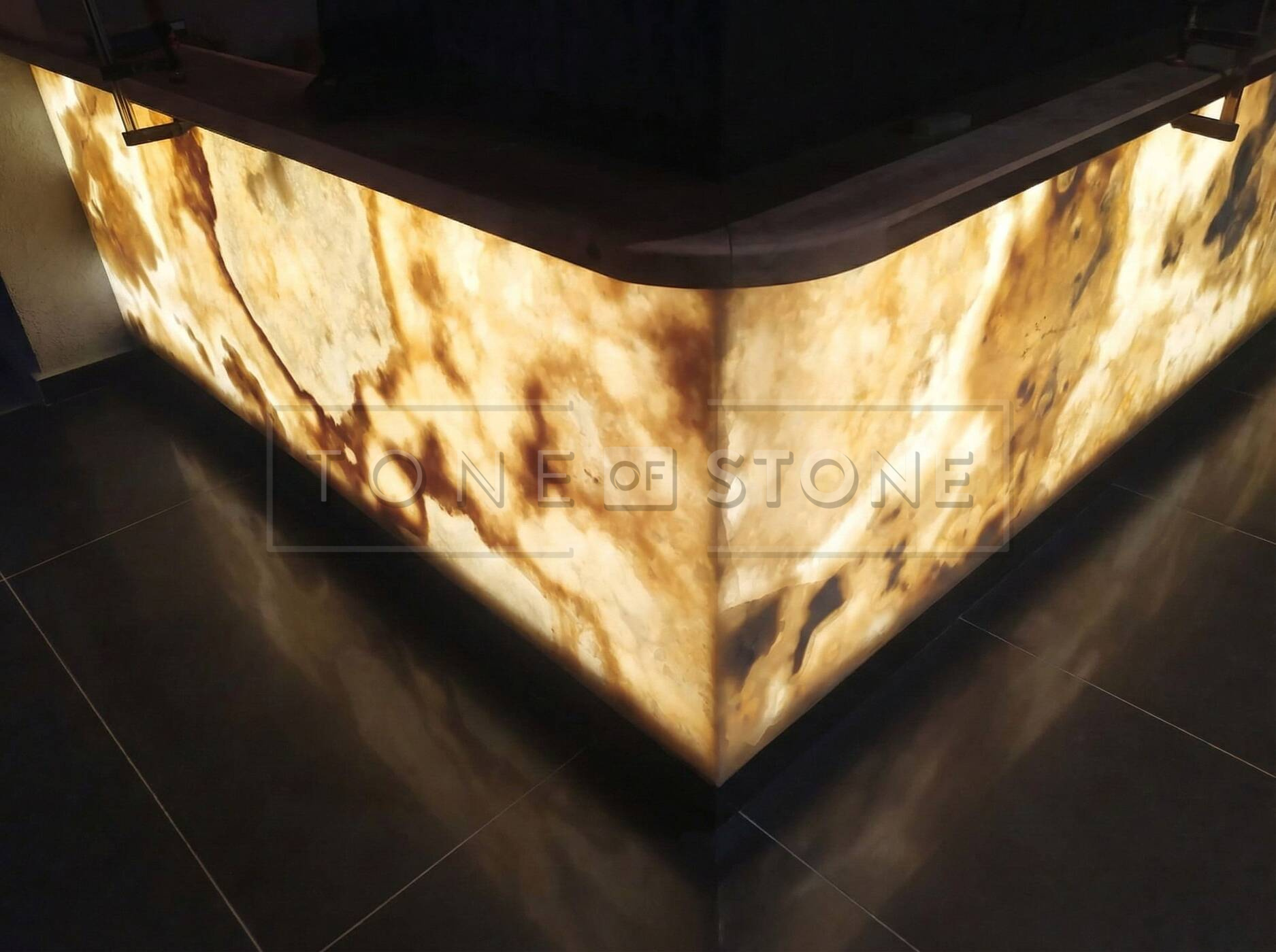 Použitý onyx, Onyx Miele, vyniká teplými medovými tóny a přirozeným žilkováním, které se v kombinaci s podsvícením jemně proměňuje v průběhu dne i večera. Lesklá povrchová úprava podtrhuje strukturu kamene a dodává celému baru elegantní, klidný a luxusní charakter.