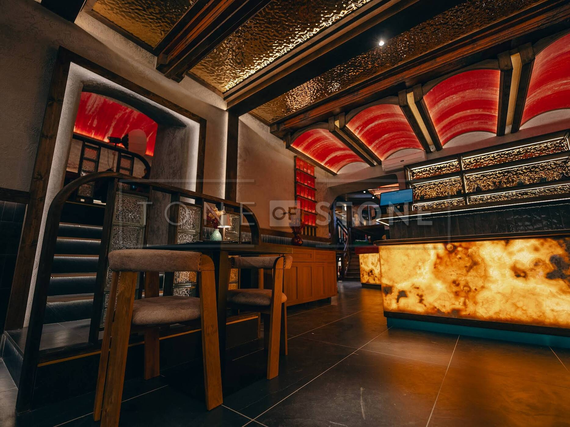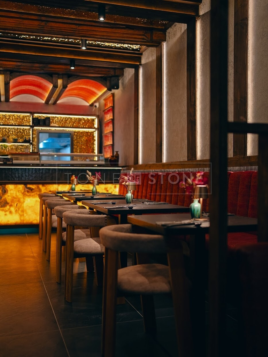 Bar restaurace je místem setkávání, atmosféry a detailů, které host vnímá často podvědomě. Právě proto má jeho vizuální ztvárnění zásadní vliv na celkový dojem z interiéru. V této realizaci vznikl prosvícený onyxový obklad baru, který se stal přirozenou dominantou prostoru a zároveň ukázkou toho, jak silný výraz dokáže mít přírodní kámen v promyšleném architektonickém řešení.