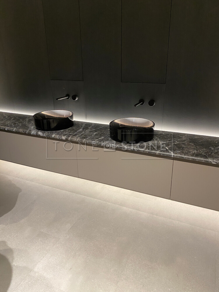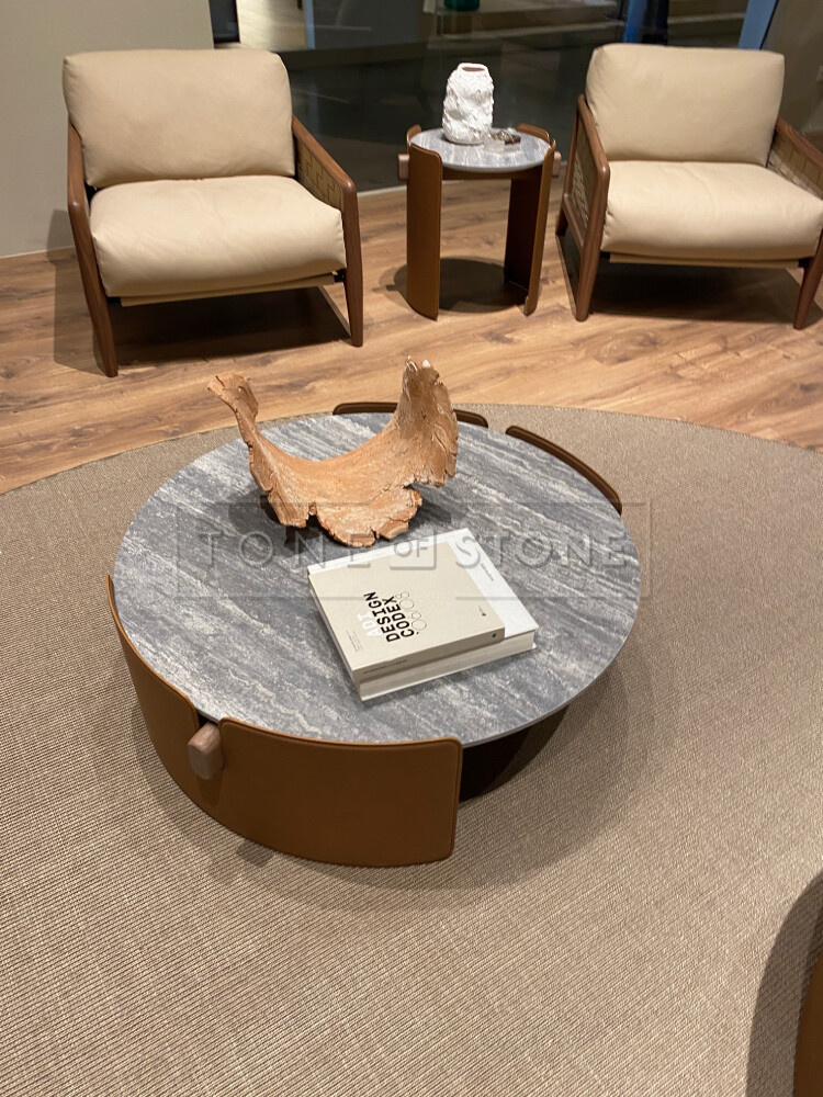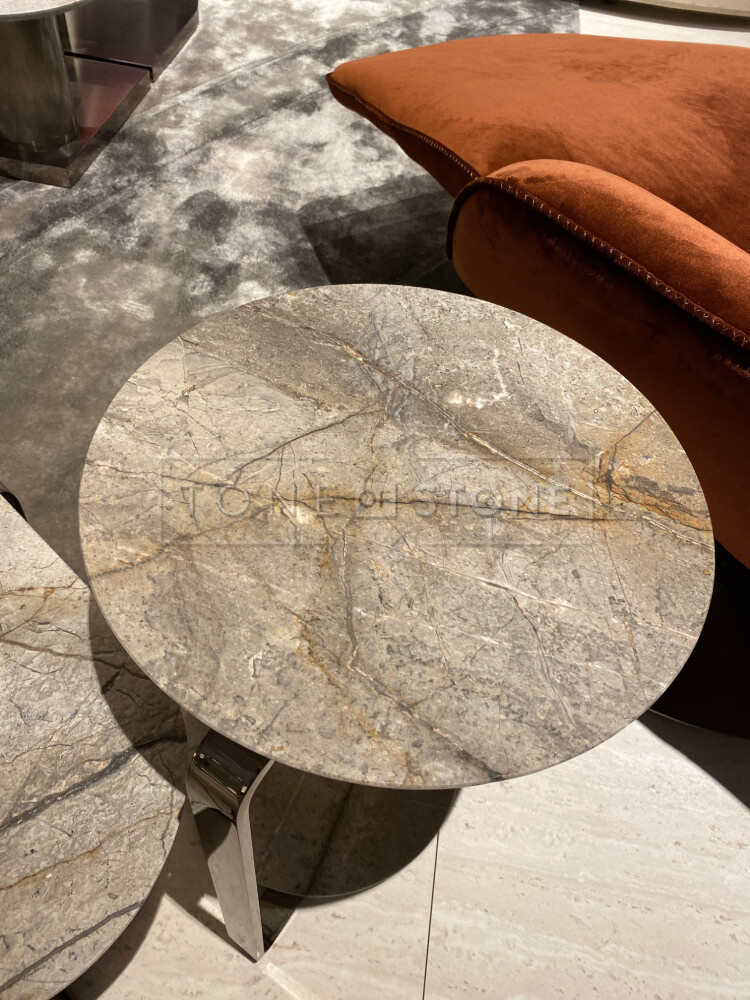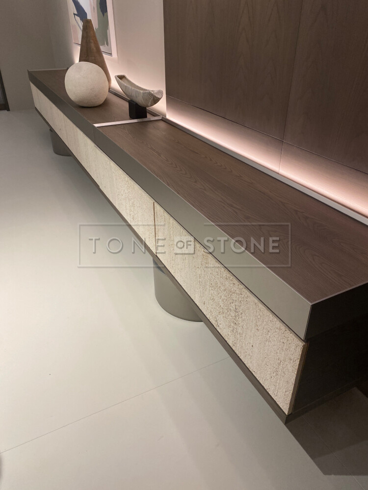 - Travertino Brown Silver - přírodní kámen typicý svou zemitou barvou s šedými tóny byl častým prvkem expozic v kombinaci se dřevem např. jako konferenční stůl z kamene.