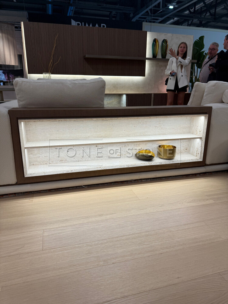 Kombinace surového pórovitého travertinu Travertino Romano Classico a skla v umělecké expozici kolekce Cave, reprezentovala originální design a umění zpracování kamene a skla v Benátkách. Expozice zahrnovala velký konferenční stůl se skleněnou deskou a travertinovými podnožemi, osvětlení kombinující přírodní kámen a sklo, malé konferenční stoly s travertinovou podnoží a skleněnou deskou v nepravidelném tvaru a toaletní stolek se zrcadlem, kde byla opět využita kominace travertinu a skla.
