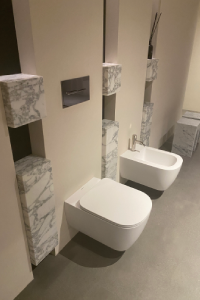 Řada světových výrobců, kteří spolupracují s nejrenomovanějšími architekty a designéry jako je např Zaha Hadid, prezentovali na veletrhu minimalistické provedení se sofistikovanými řešeními úložného prostoru a nevšední kombinací tvarů. Tento přístup k interiérovému designu bylo možné vidět například u kamenných koupelnových desek a kamenných umyvadel. Kombinace zaoblených rohů i okrajů a ostrých tvarů kamenného umyvadla vytvářela zajímavý kontrast.