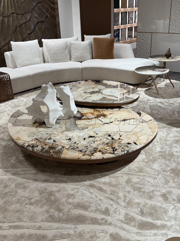Tyto přírodní kameny nebyly pouze dekoračním prvkem – byly hlavními nositeli trendu propojujícího eleganci, přírodu a udržitelnost..