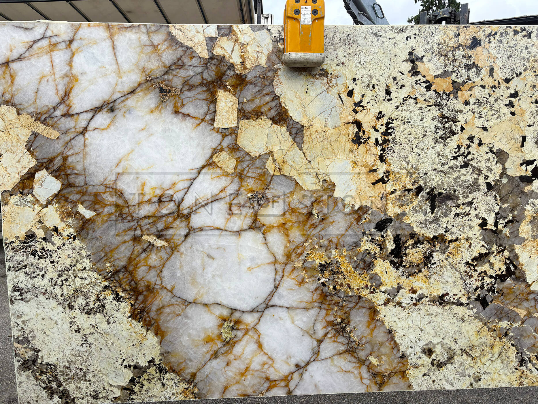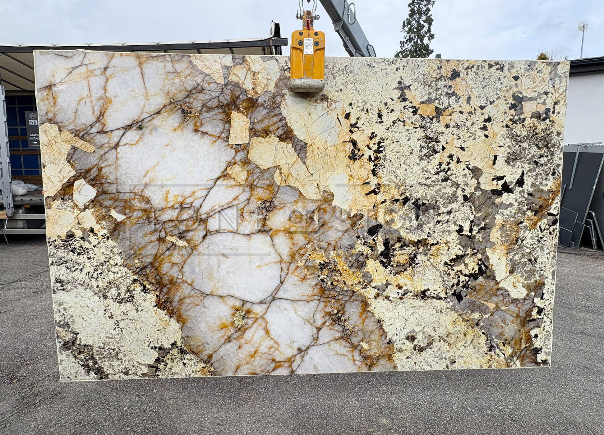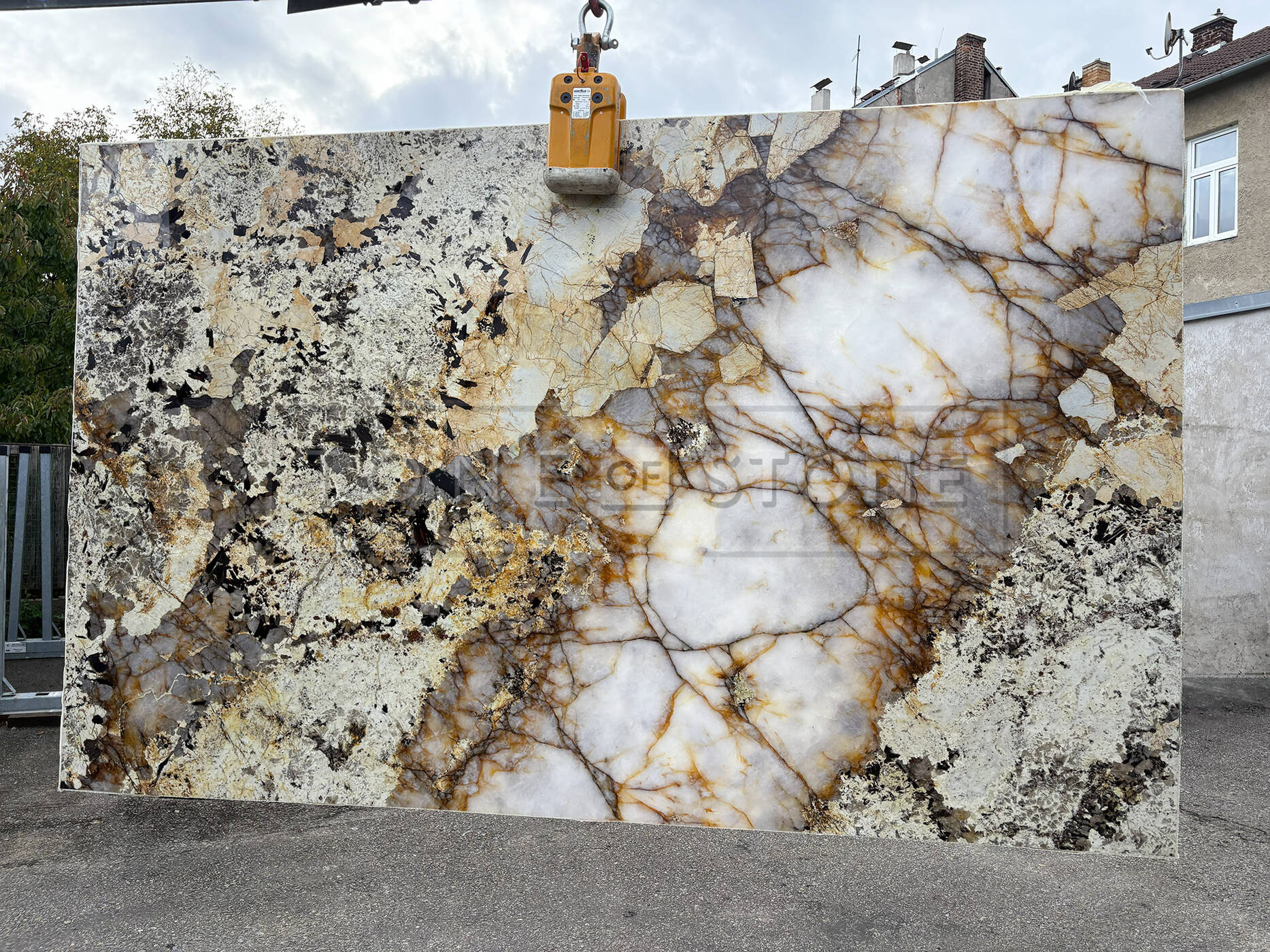 Kvarcit Patagonia (někdy označovaný také jako žula) je exkluzivní přírodní kámen pocházející z Brazílie. Tvoří jej převážně křemen (cca 93 %) s příměsí živce a slídy, což mu dodává mimořádnou tvrdost, hustotu a velmi nízkou nasákavost (pouze okolo 0,03 %). Tento kvarcit je ceněn pro svůj světlý béžový až slonovinový podklad, který doplňuje dramatické žilkování a krystalické inkluze v odstínech šedé, černé a zlatobéžové. Díky pevnosti v tlaku okolo 136 MPa a tvrdosti 6–7 na Mohsově stupnici se skvěle hodí pro kvarcitové kuchyňské desky, kamenné stoly, kamenné obklady stěn technikou bookmatch, obklady krbu z přírodního kamene a mnoho dalšího. Díky částečně průsvitným krystalickým strukturám lze navíc tento kámen využít i pro efektní podsvícené aplikace, které zvýrazní jeho přirozenou hloubku a jedinečný charakter.
